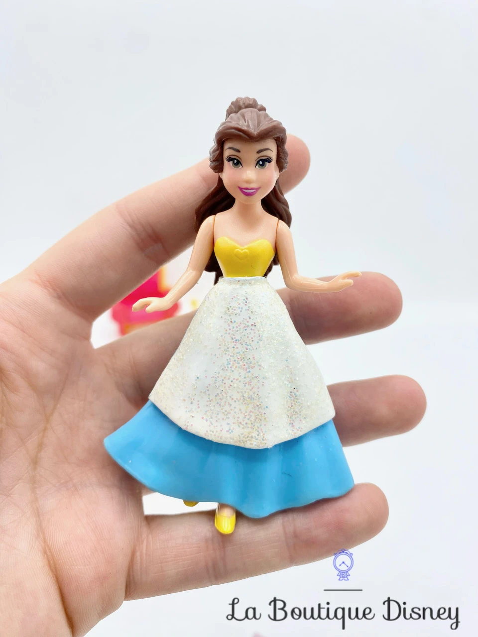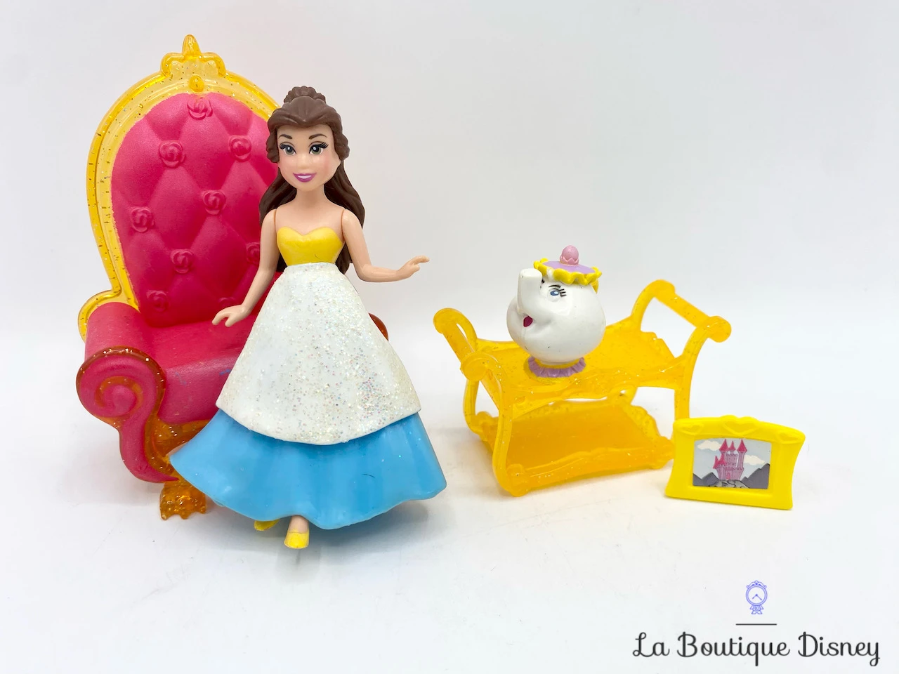 Mini poupée en plastique de la princesse Belle dans le style Fashion Polly Pocket. Elle est accompagnée de mobiliers avec un grand fauteuil et une petite table jaune. Il y a également avec elle son ami la théière Madame Samovar et un petit cadre jaune du château.