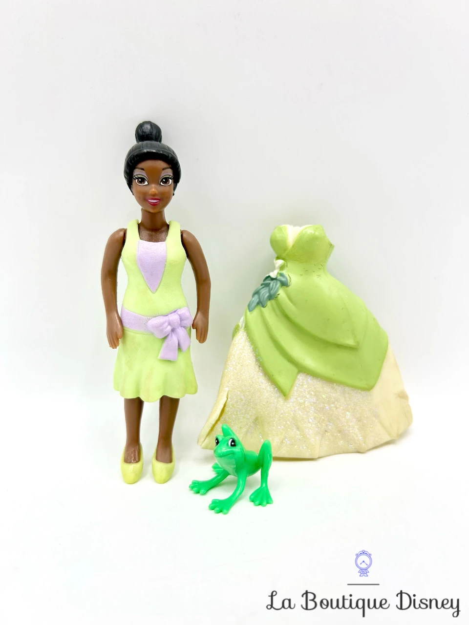 Mini poupée en plastique de la princesse Tiana dans le style Fashion Polly Pocket. Elle est accompagnée d’une mini figurine de Naveen en grenouille. Deux robes en silicone sont également inclues, la robe de bal verte et la robe de ville verte et violette.