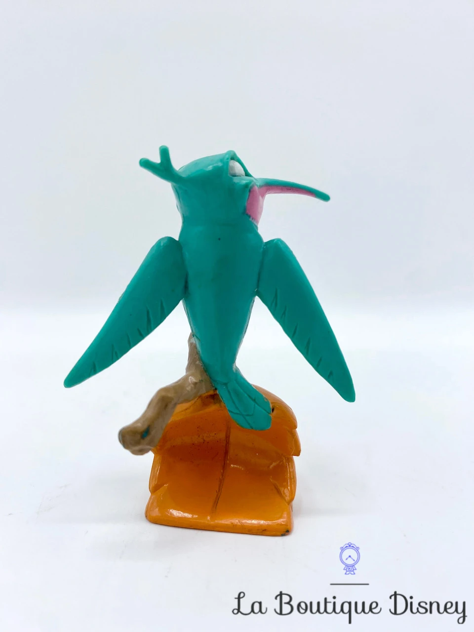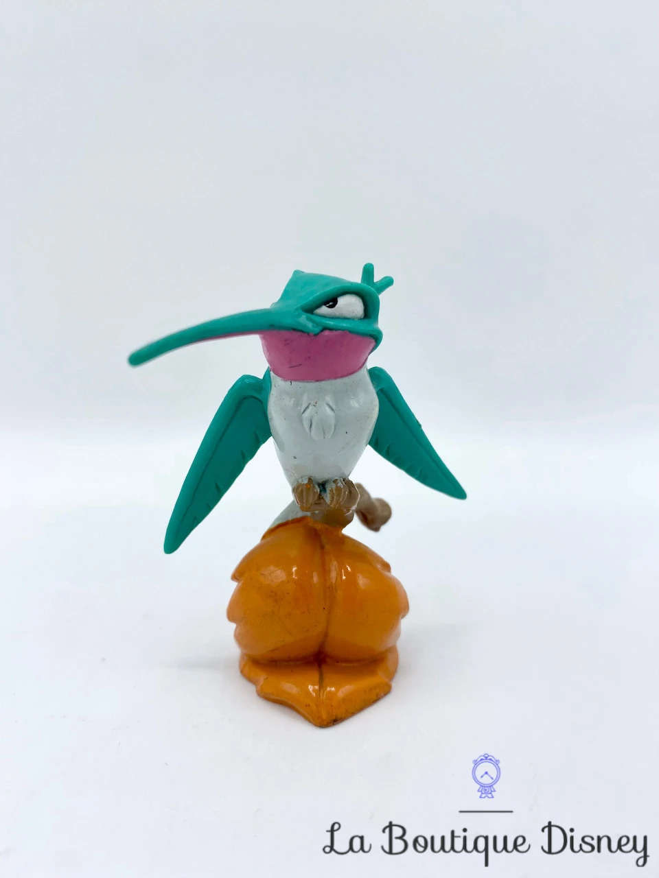 Figurine en PVC de Flit, l’oiseau colibri ami de Pocahontas et Meeko. Il est bleu turquoise, rose et blanc avec un long bec pointu. Il est posé sur une feuille orange / marron.