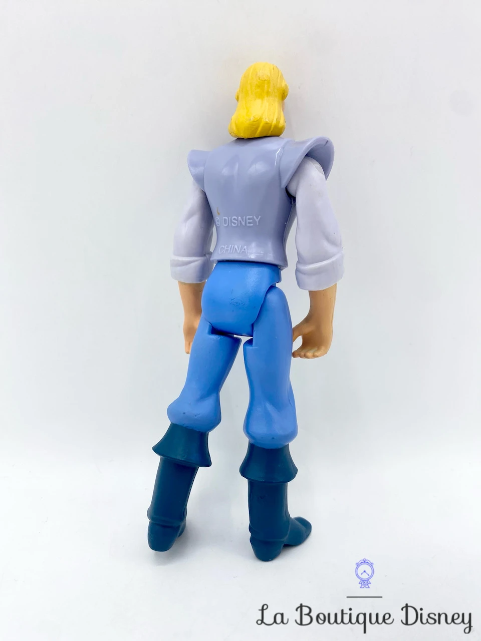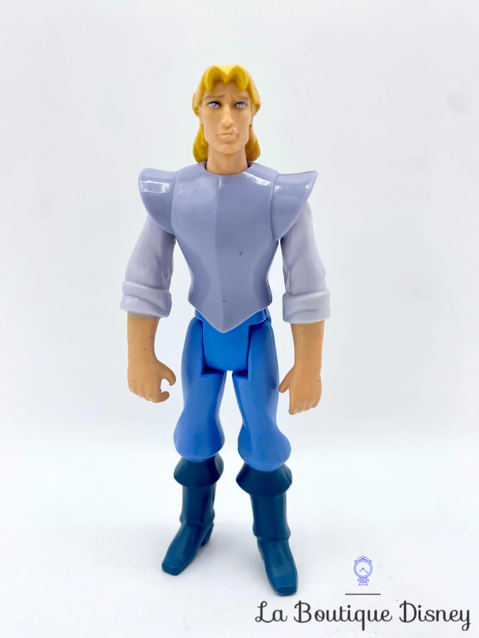Figurine en plastique de John Smith, le jeune et bel explorateur anglais. Il porte une tenue grise et bleue et de grandes bottes. John Smith a une longue chevelure blonde et des yeux bleus. Ses membres sont articulés.