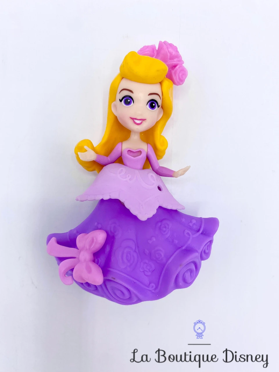 Petite poupée polly de la princesse Aurore. Elle porte une tenue amovible rose et violette avec des petits accessoires pouvant se clipser sur la robe. Pas de haut.