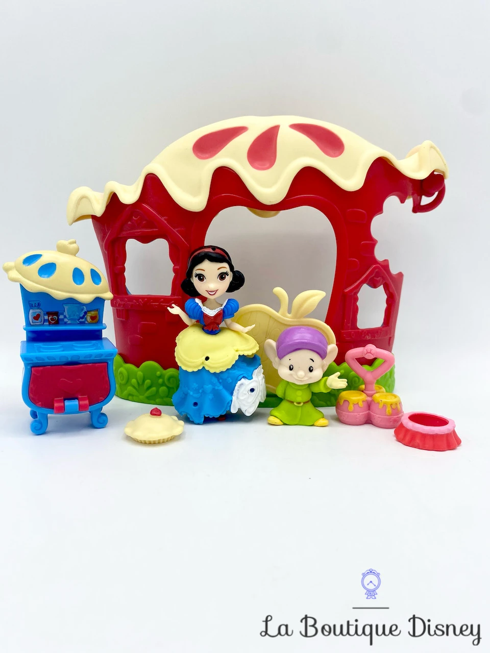 Petite poupée polly de la princesse Blanche Neige, elle est prête à danser avec ses amis les nains. Elle porte une tenue amovible bleue et jaune avec des petits accessoires pouvant se clipser sur la robe. A côté d’elle se trouve Simplet, et des petits accessoires. Il y a aussi une maison rouge, c’est le café pomme où elle peut cuisiner en toute tranquillité !