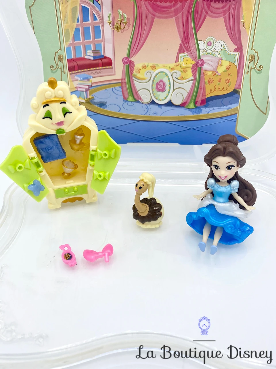 Ensemble contenant une petite valise transparente avec poignée de transport jaune et un ensemble de jeu de Belle. La mini-poupée de la princesse a des vêtements amovibles. Belle est accompagnée de sa garde robe préférée « L’Amoire » et de Plumette. En fond de la boite, il y a une image carton représentant la chambre de Belle dans le château. Ensemble de jeu idéal pour les petites princesses !