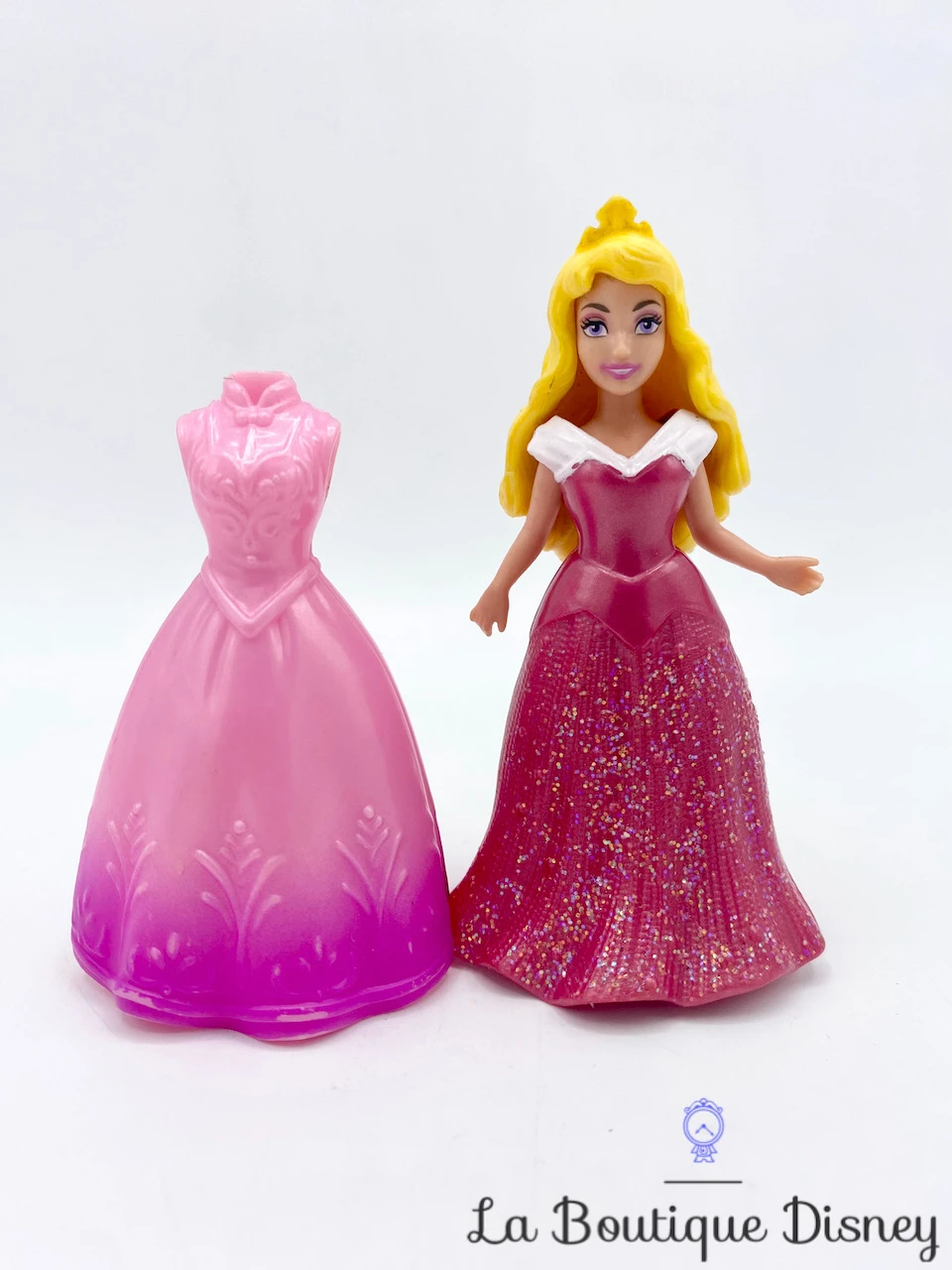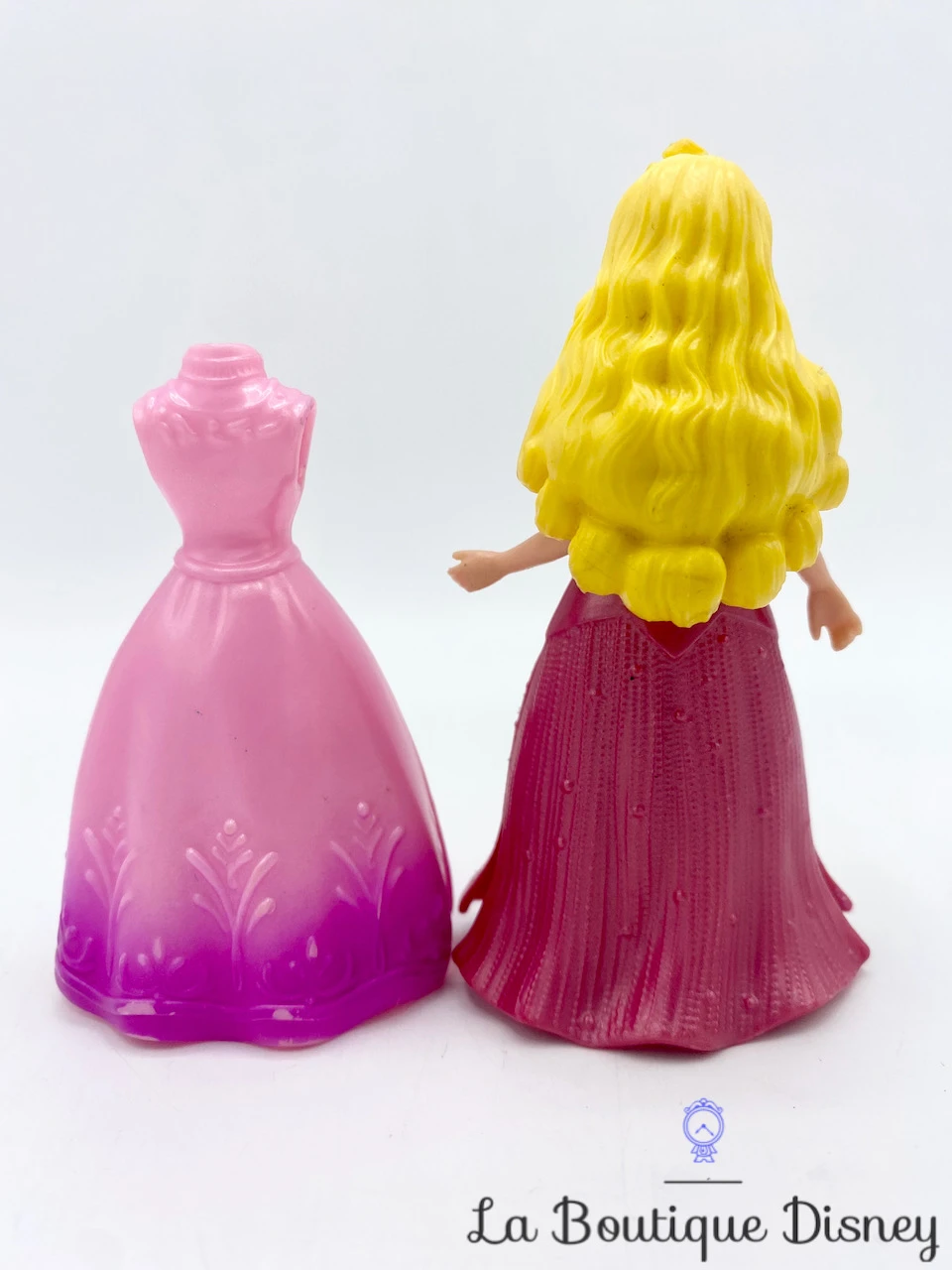 Figurine en plastique d’Aurore avec ses deux robes roses pouvant se clipser sur la poupée. Elle a de longs cheveux blonds et des yeux violets.