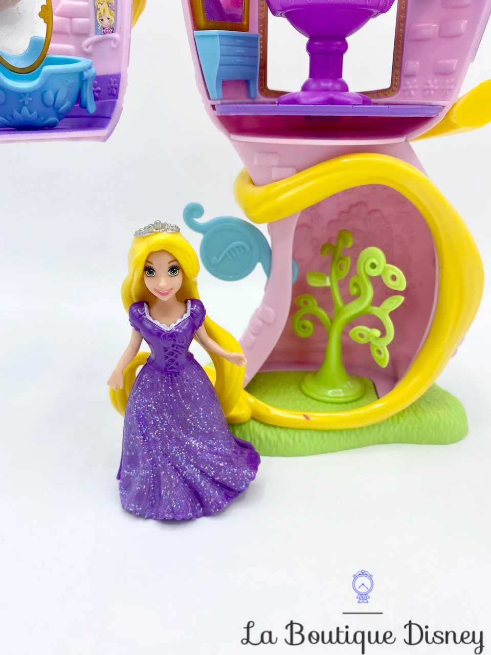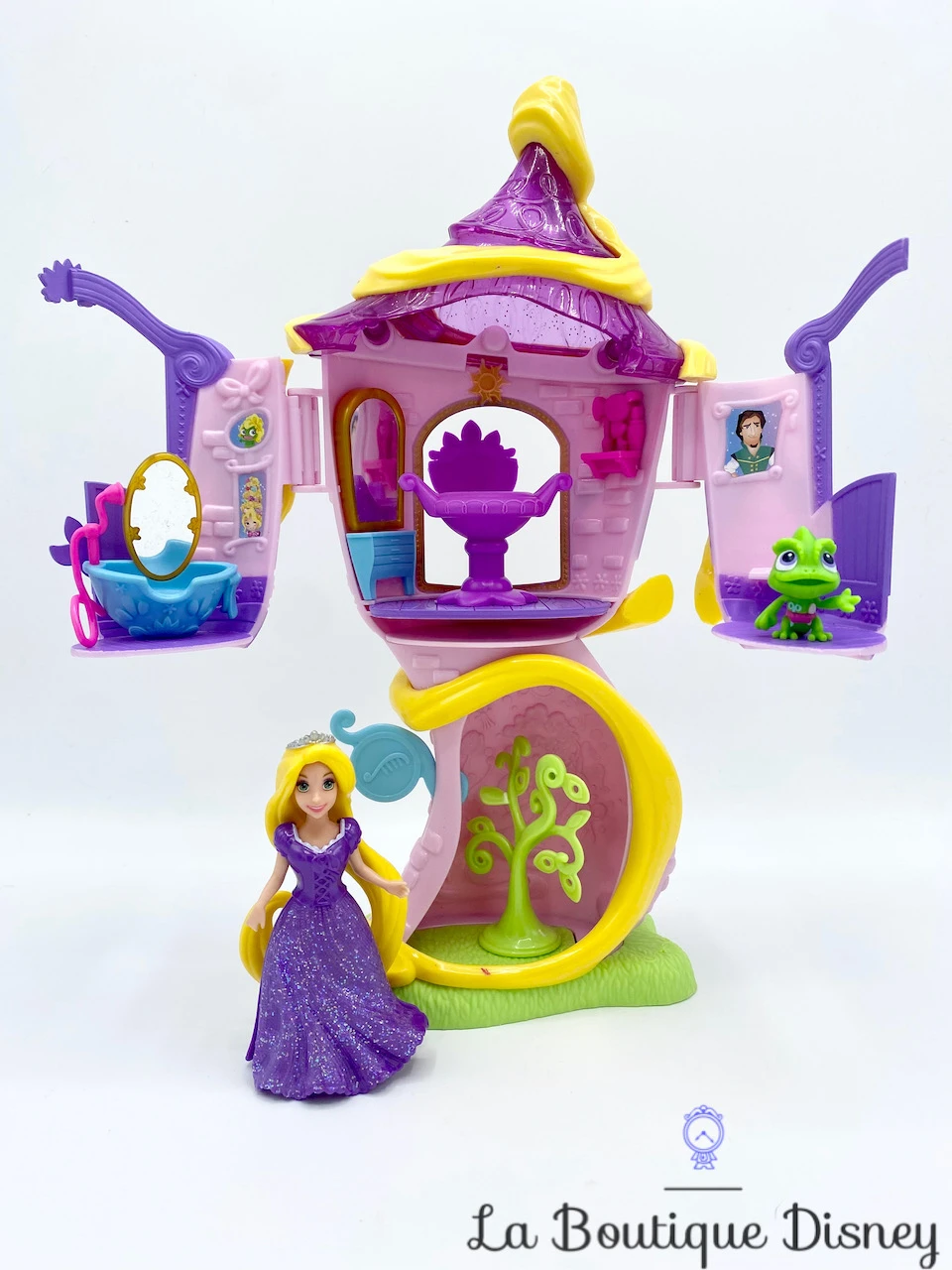 Figurine en plastique de Raiponce avec sa robe violette à paillettes pouvant se clipser sur la poupée. Elle a de longs cheveux blonds et des yeux verts. Elle se trouve dans sa tour violette autour de laquelle s’enroule ses longs cheveux. La tour s’ouvre en haut pour laisser place à un espace de jeu atelier de coiffure. Il y a de très beaux stickers avec le portrait de Flynn, de Pascal et de Raiponce avec de drôles de coupe de cheveux. Nombreux accessoires : espace coiffure, chaise pivotante, figurine de Pascal en coiffeur, et arbre.