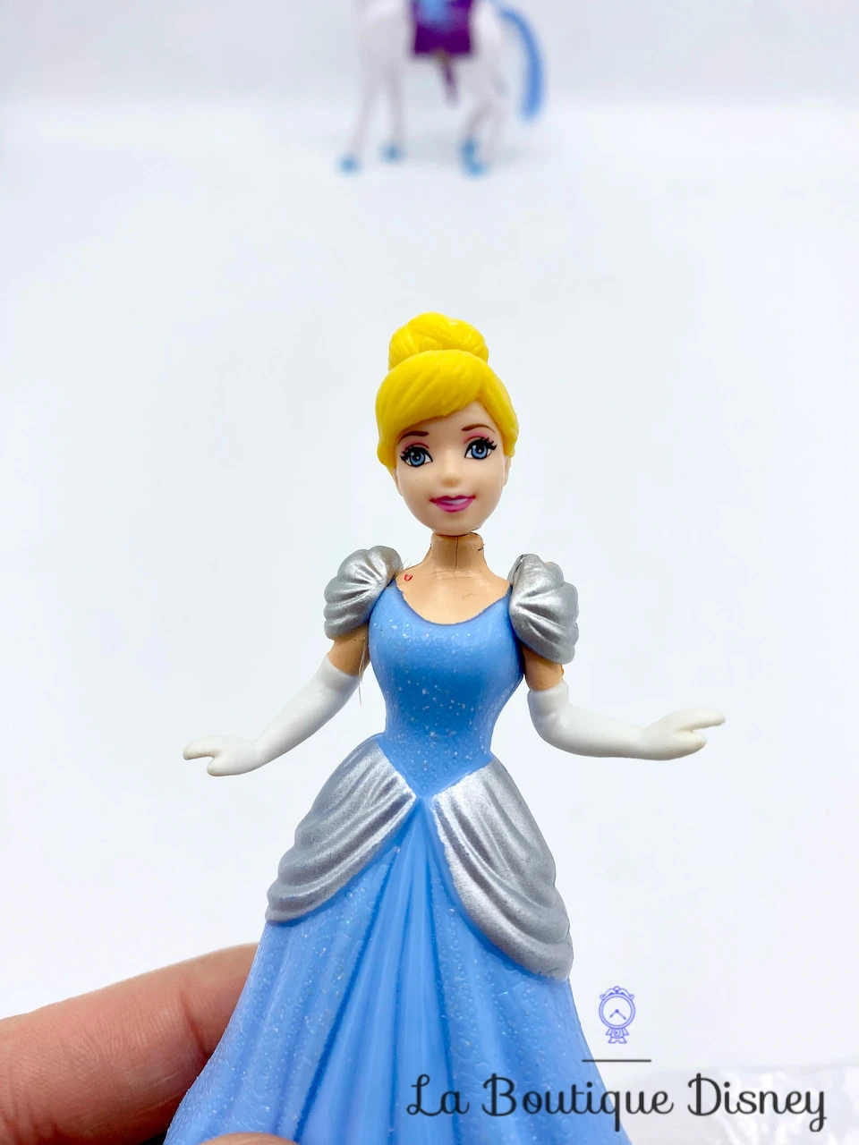 Mini poupée en plastique de la princesse Cendrillon avec une robe de bal bleue à paillettes. La robe n’est pas amovible. Fait partie du set « Dancing Duet », figurine pouvant tourner sur une plaque ici non fournie. La princesse est accompagnée de son cheval blanc à la crinière bleue.