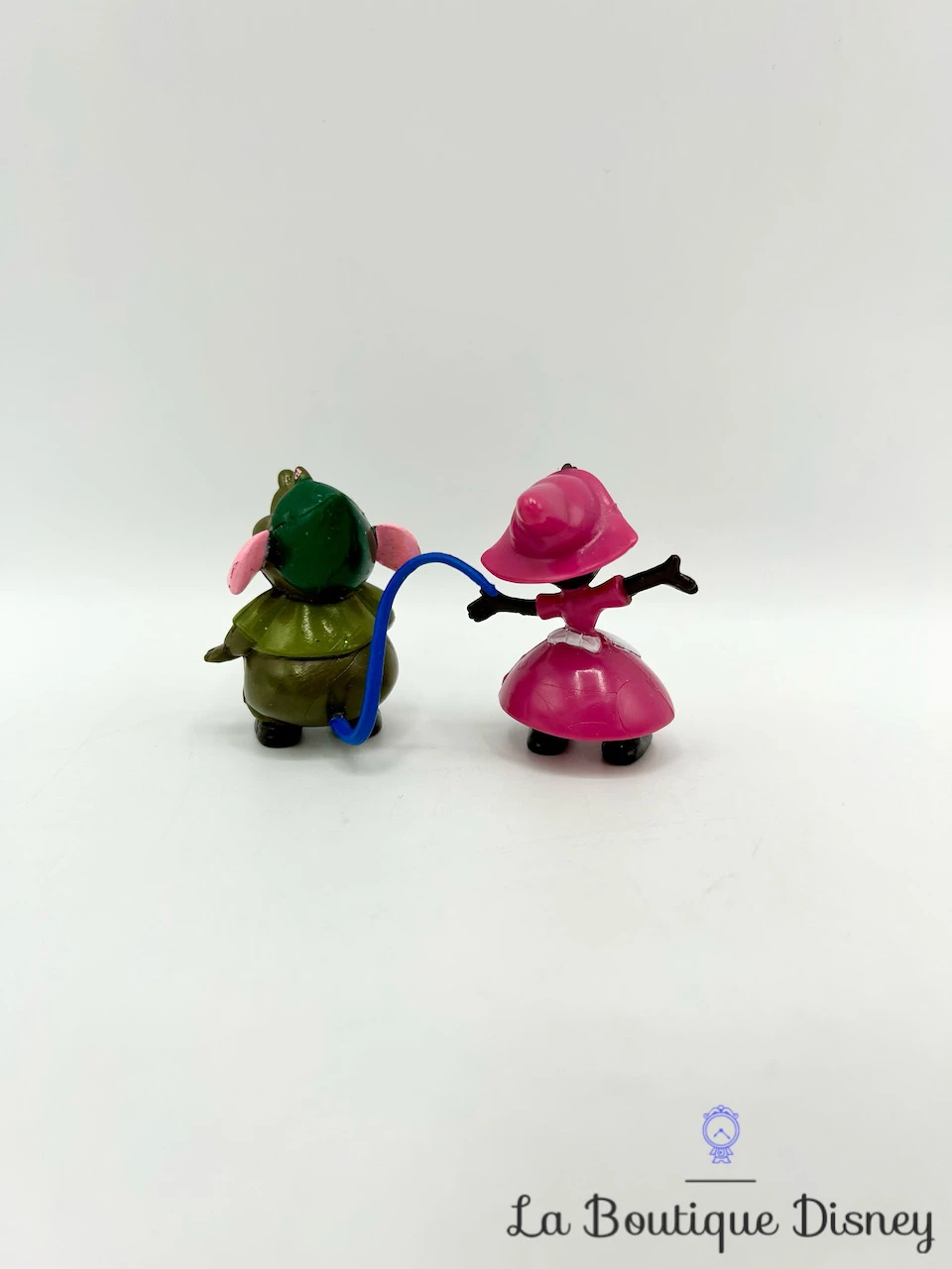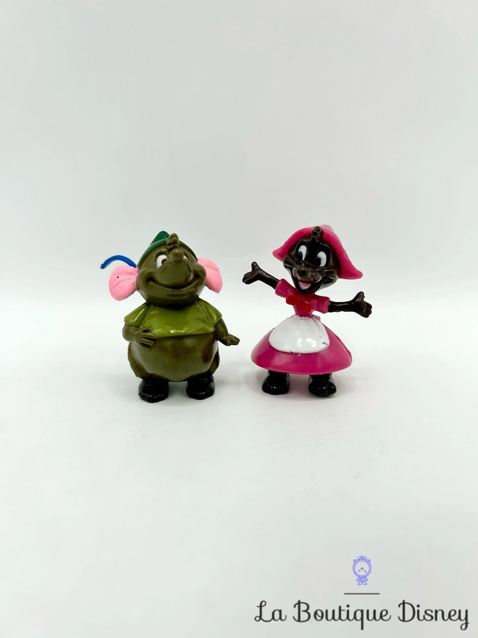 Figurines en plastique de deux petites souris présentes dans le dessin animé Cendrillon : Gus Gus la souris gourmande au tee-shirt vert et Perla la souris à la robe rose.