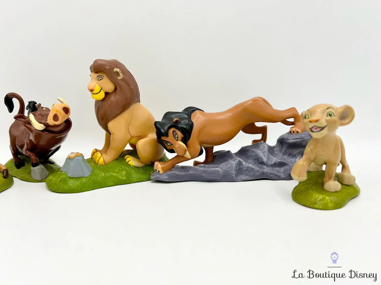 Ensemble de 6 figurines en plastique de vos personnages préférés du film Le roi lion. Il y a le lionceau Simba, son père Mufasa, le suricate Timon, le phacochère Pumbaa, le méchant Scar et la petite lionne Nala. Toutes les figurines du playset ont des socles verts ou gris.