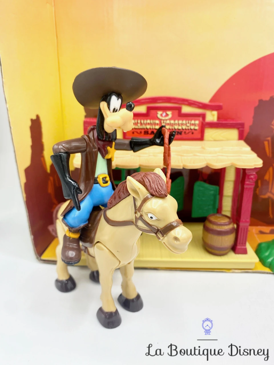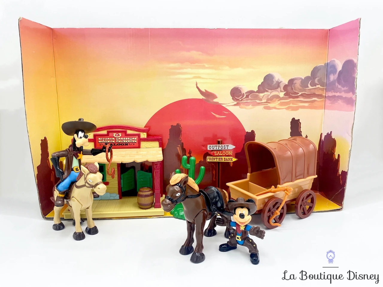 Ensemble de jeu comprenant deux figurines en PVC de Mickey et Dingo dans leurs tenues du Far West. Ils sont accompagnés de deux chevaux marron, d’un saloon « Diamond Horseshoe Saloon », d’un tonneau, d’un lasso, d’un cactus, d’un panneau de signalisation et d’une charette. Derrière eux se trouve un grand décor en carton représentant un décor western.