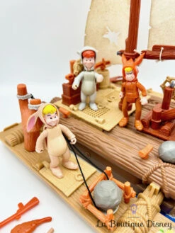 Figurine en plastique de Robin des Bois, le renard roux habillé d’une tenue verte. Il a un chapeau jaune assorti avec une plume rouge. A côté de lui, se trouve un Loup rose vêtu d’un ensemble marron. Ils tiennent dans leur main un arc très réaliste avec une corde véritable. Accessoires : deux arcs, deux flèches, une épée et un carquois.