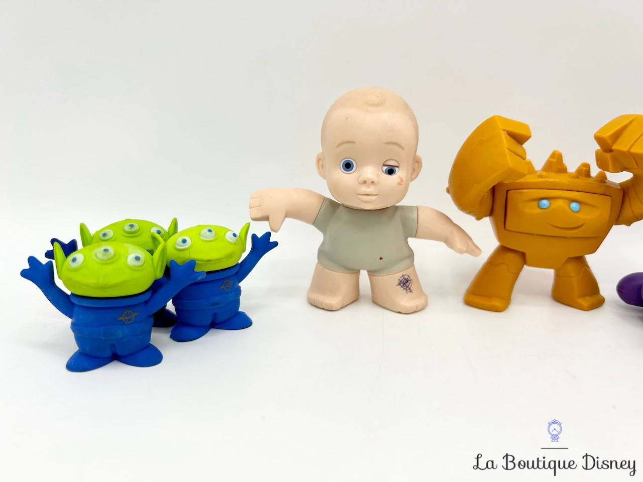 Lot de figurines du dessin animé Toy Story 3. Vous retrouverez notamment trois aliens, Pile Poil le cheval marron, Karting la voiture de course, Big Baby le poupon bras droit de Lotso, Flex la pieuvre violette et enfin Tchac le jouet orange aux gros muscles. Figurines inédites !