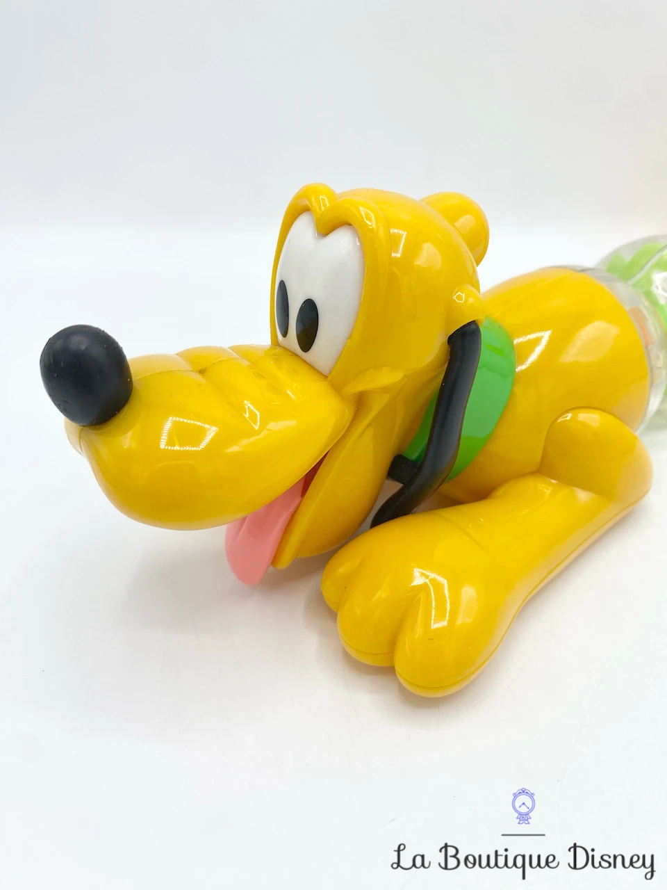 Hochet en plastique représentant Pluto, l’ami fidèle de Mickey Mouse de l’univers Disney. Il est jaune, porte son collier vert habituel et il tire une langue bien rose ! Il est en position couché et la partie centrale de son ventre conçue en tourbillon est transparente avec à l’intérieur une mutitude de billes multicolores. Les bébés et les enfants en bas âge aimeront s’amuser à entendre le son / le bruit des billes à chaque fois que Pluto bougera !
