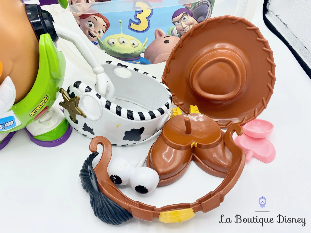 Sceau contenant de nombreux accessoires pour déguiser Mr Patate en Buzz l’éclair ou en Woody : ailes, chapeaux, chaussures, costumes…