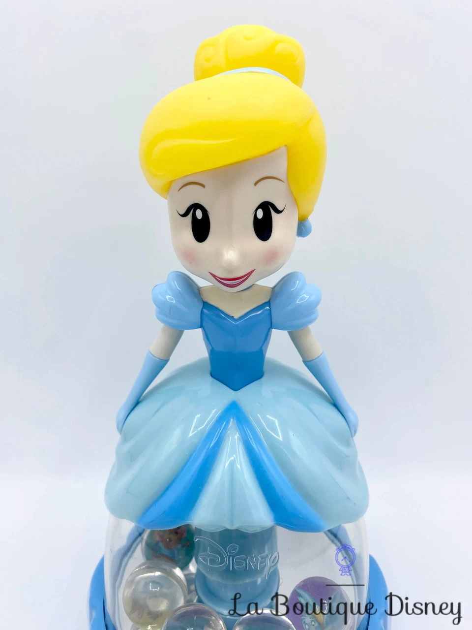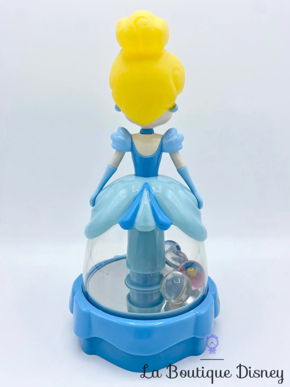 Jouet sur le thème de Cendrillon. En appuyant sur la princesse en plastique, les billes qui sont à l’intérieur de la robe à l’effigie des oiseaux et des souris (Jaq et Gus) se mettent à tournoyer avec un effet miroir féérique. Tous les petits amis aident Cendrillon à confectionner sa robe de bal !
