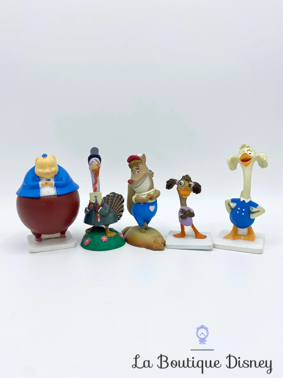 Playset de 5 figurines en plastique de personnages différents du film Disney Chicken Little. Il y a : Runt Of The Litter, le gros cochon, Ugly Duckling, le canard avec des couettes, Focy Loxy, le petit renard avec une casquette, Turkey Lurky, la dinde avec un chapeau haut de forme et enfin Lucy Goosey.