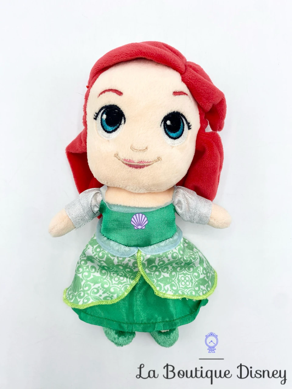 Peluche de la plus célèbre des sirènes Disney, Ariel ! Peluche de la princesse avec ses longs cheveux rouges, ses yeux bleus brodés et sa robe verte satinée. Un petit coquillage violet est imprimé sur sa poitrine. Elle a une tête plus grosse que son corps, ce qui la rend très drôle ! Peluche petit format.