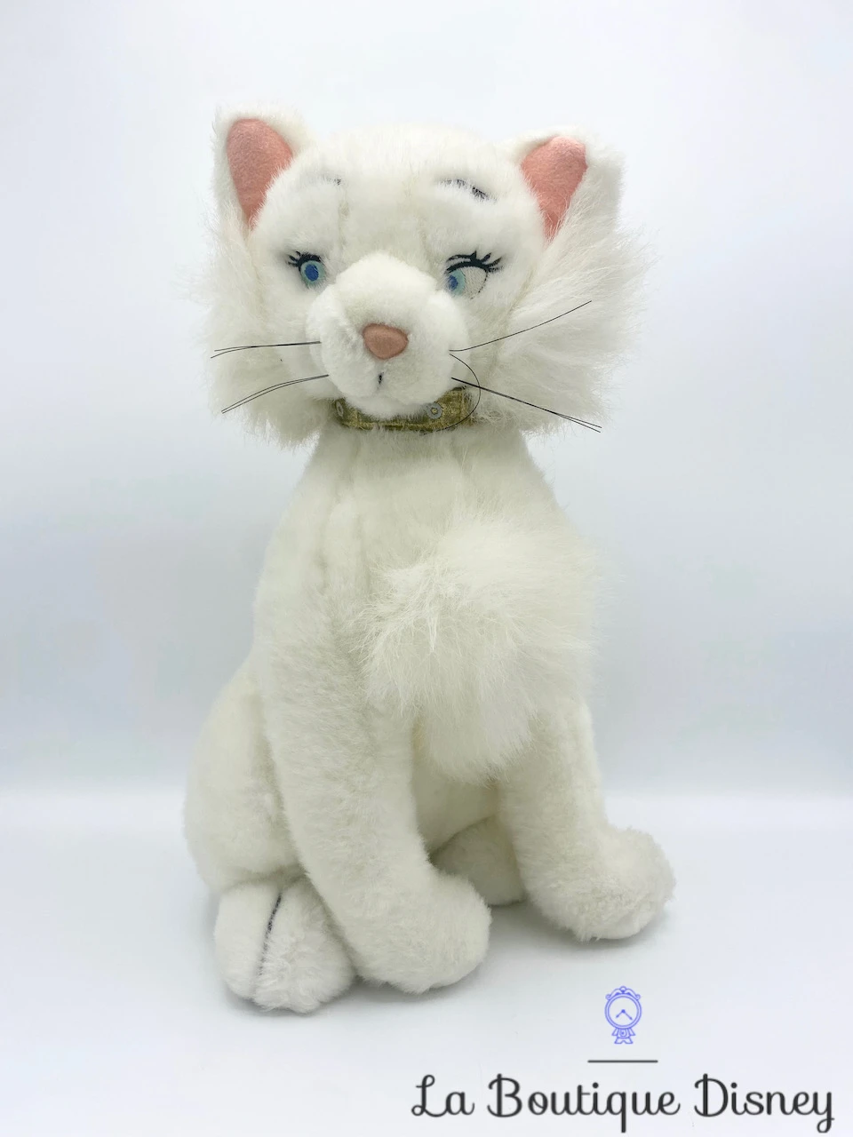 Peluche de Duchesse, la compagne de Thomas O’Malley et mère des chatons Marie, Berlioz et Toulouse. Chat de couleur blanc avec des petites oreilles roses et de beaux yeux bleus brodés. Elle a un très beau collier doré.