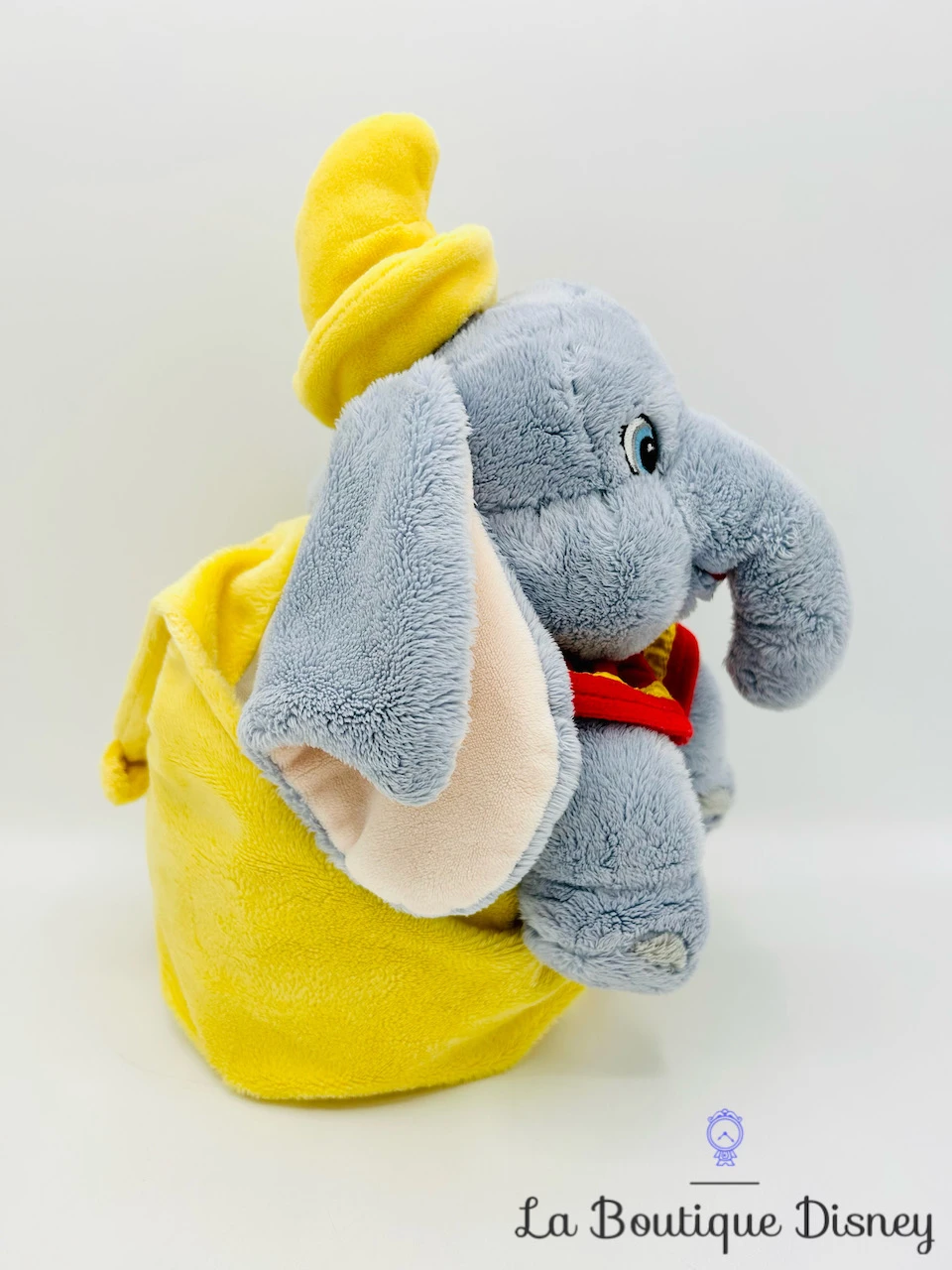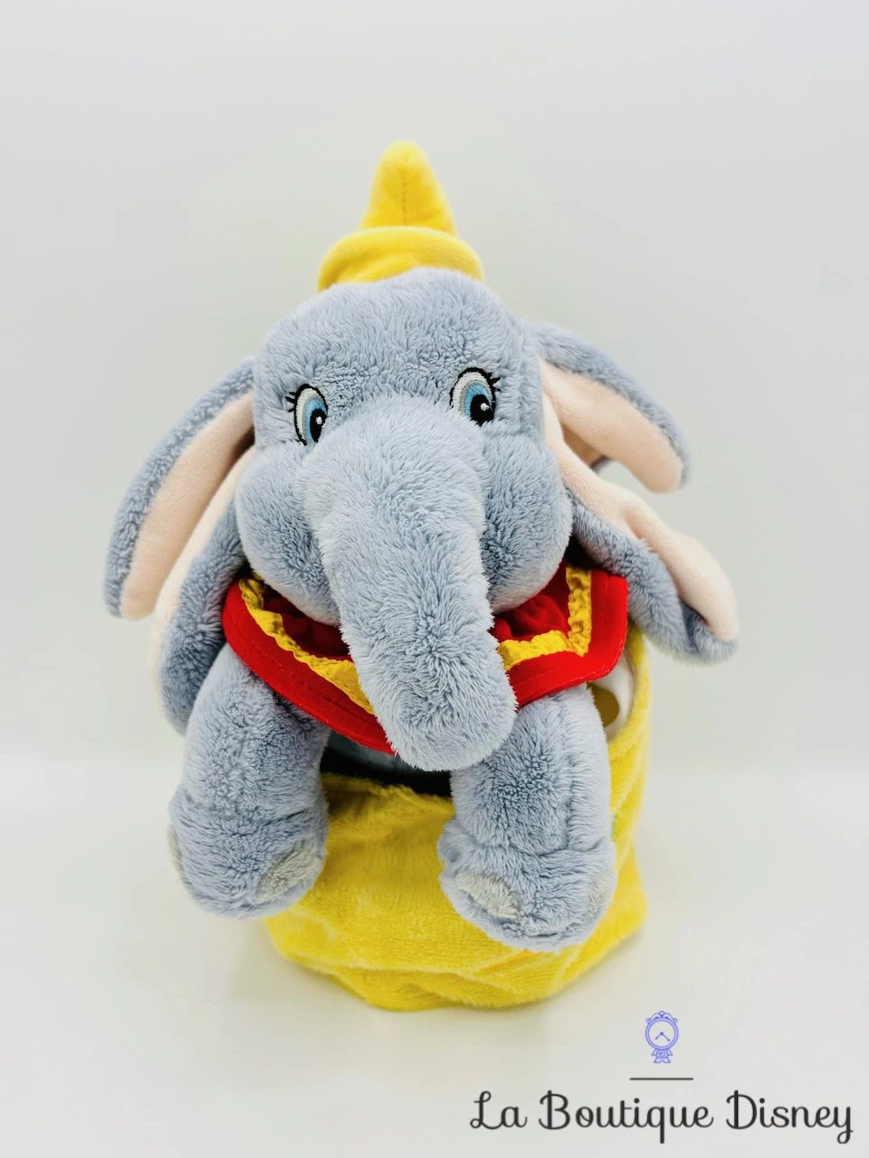 Peluche très douce représentant Dumbo l’éléphant aux grandes oreilles rose. Il a une longue trompe et des yeux bleus brodés. Il porte un petit chapeau jaune et une colerette rouge et jaune de clown autour du cou. Il est assis dans un baluchon jaune utilisé par Monsieur Cigogne dans le dessin animé pour la livraison des bébés. Monsieur Cigogne est brodé sur le sac, on reconnait son plumage blanc, sa veste bleue et sa casquette rouge avec une visière. Les enfants vont adorer ce petit sac avec Dumbo l’éléphanteau à l’intérieur !