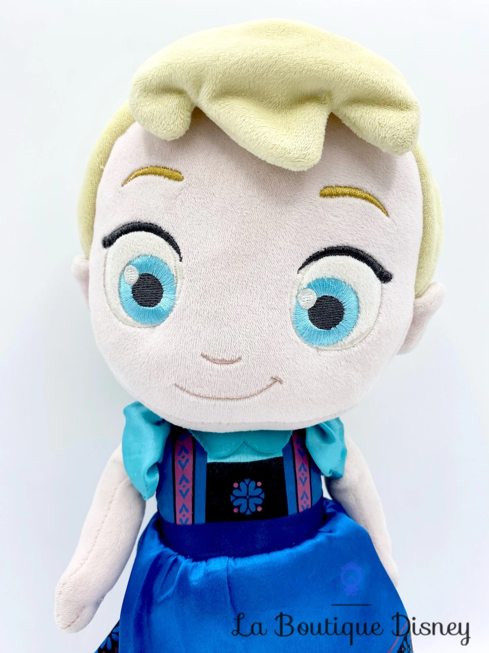 Peluche en polyester de la princesse Elsa quand elle n’était encore qu’une petite fille. Avec sa longue chevelure blonde, elle est facilement reconnaissable. Elle est habillée d’une robe bleue en satin, comme dans le film lorsqu’elle était jeune. Elle a une grosse tête avec de grands yeux bleus brodés. Cette peluche poupée est extrêmement mignonne, et elle donnera envie à tous les enfants de devenir son nouveau compagnon !