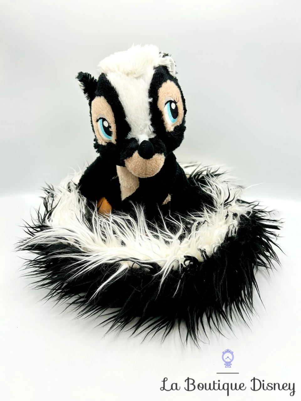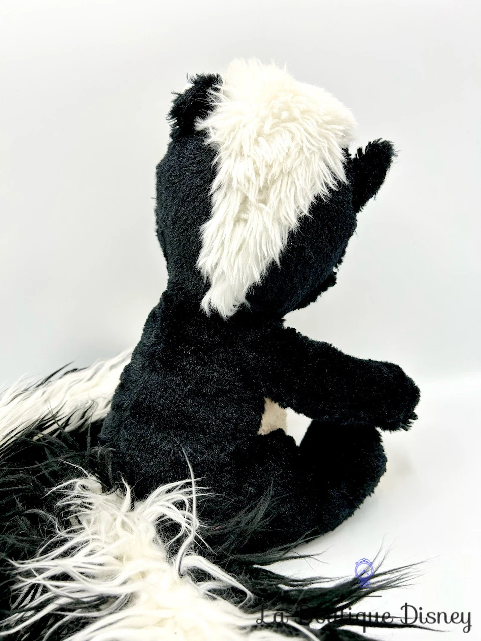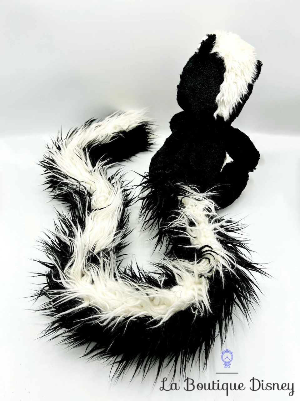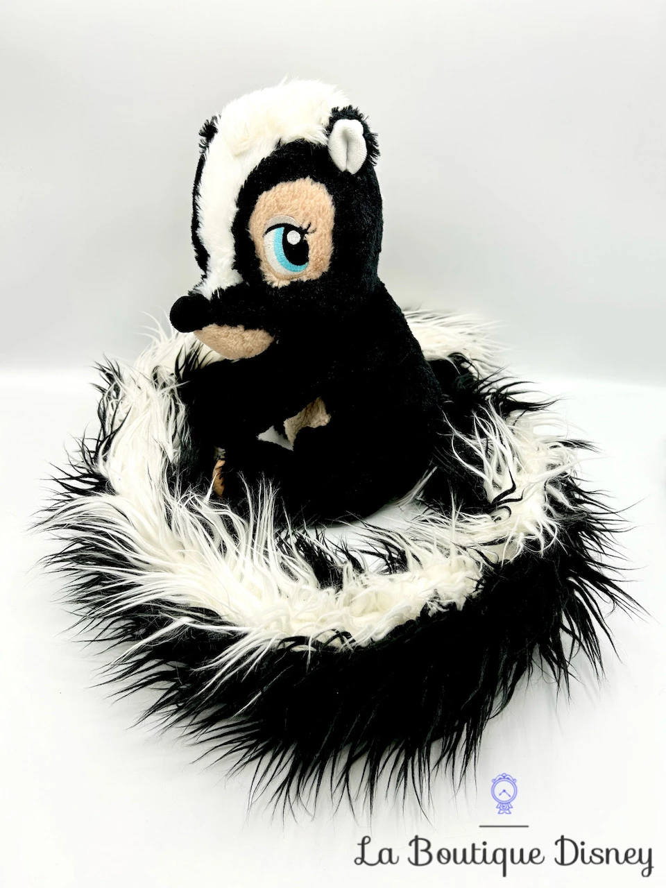 Peluche très douce de la mouffette nommée Fleur, amie de Bambi et de Panpan. Elle est de couleur noire et blanche et a de jolis yeux bleus brodés. Peluche très douce avec un joli pelage. La particularité de cette peluche est sa très longue queue touffue en poils noirs et blancs : plus de 110 cm !