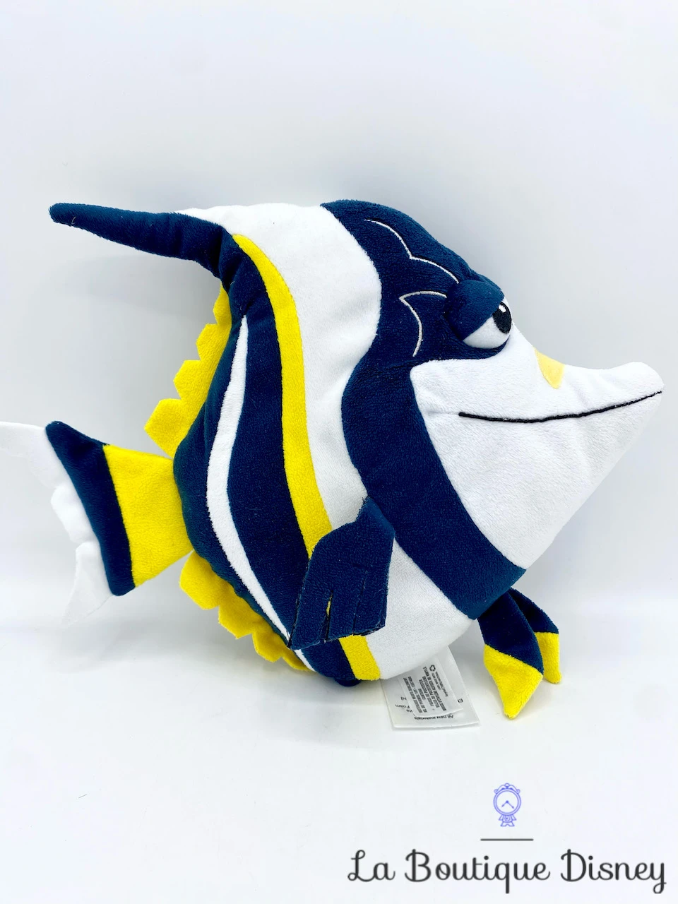 Peluche en ployester de Gill, le chef de l’aquarium du cabinet dentaire. Il est secondé par Boule. Gill est un poisson de la race Zancle cornu ou autrement appelé Idole des Maures. Il a des rayures de couleurs bleues, jaunes et blanches sur tout son corps et ses nageoires. Il a sa cicatrice bien reconnaissable à côté de son oeil. Gill a les yeux noirs et affiche un large sourire. Présence de l’écusson Disney Store Authentic Original sur le bas de la peluche.