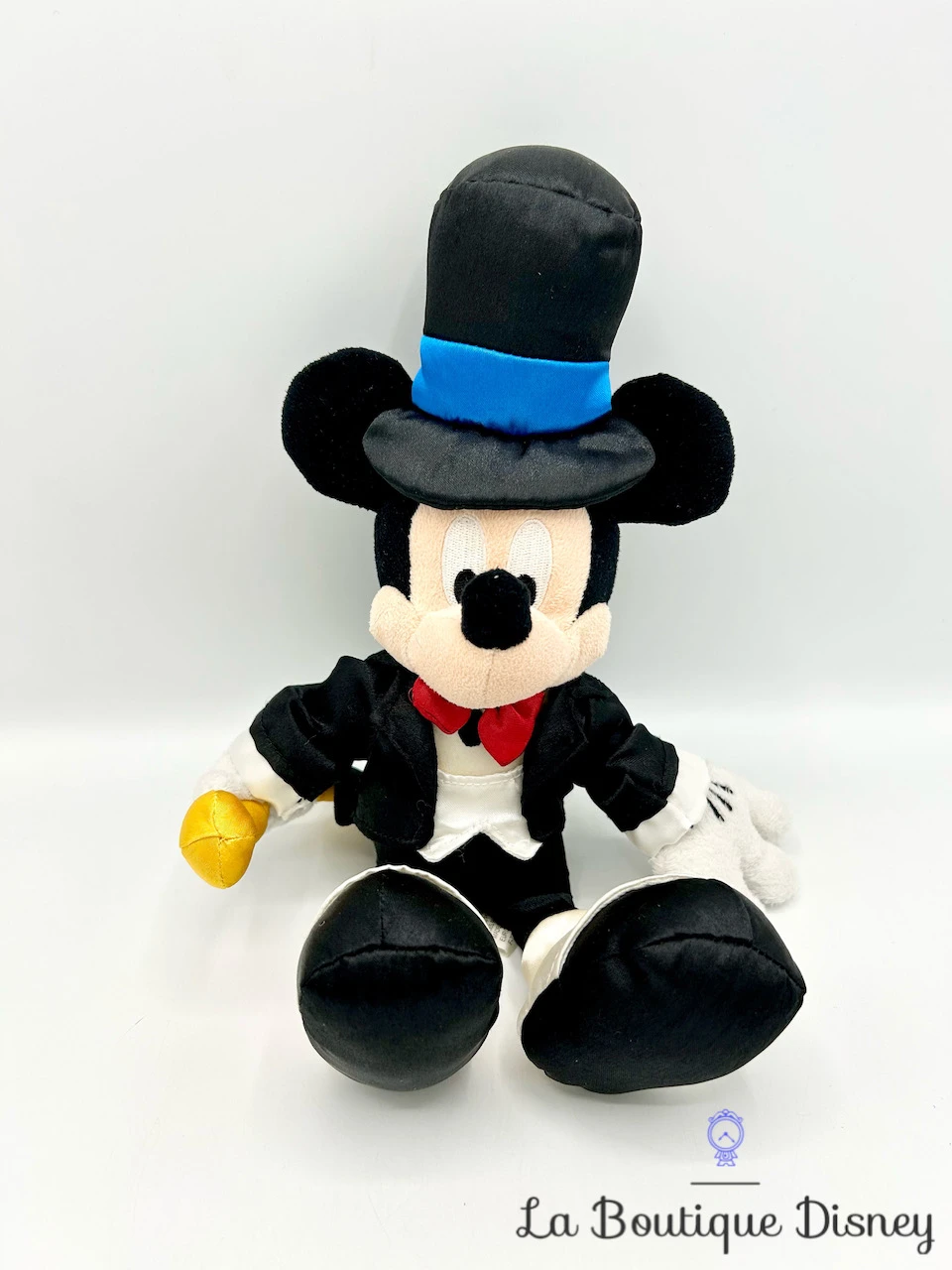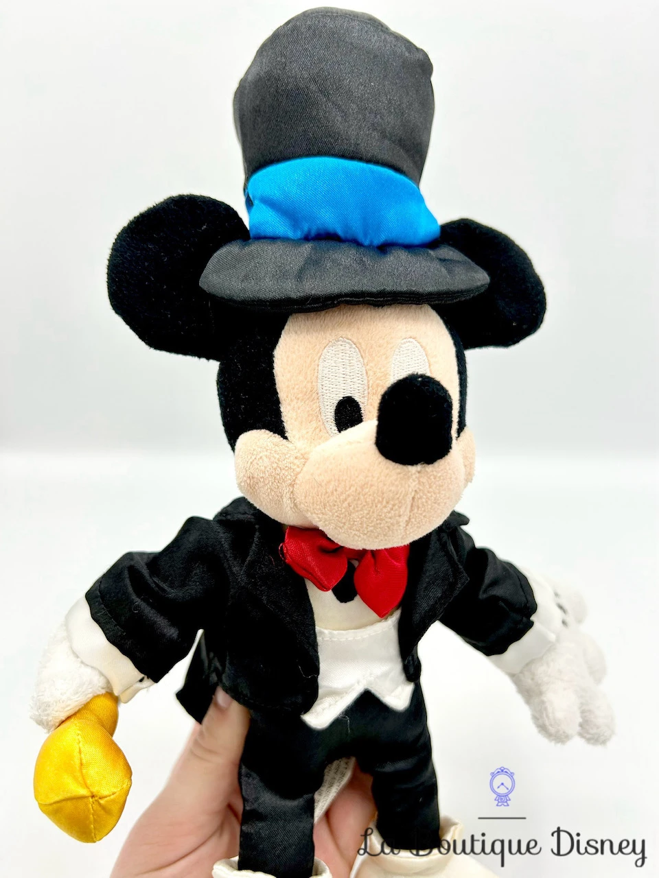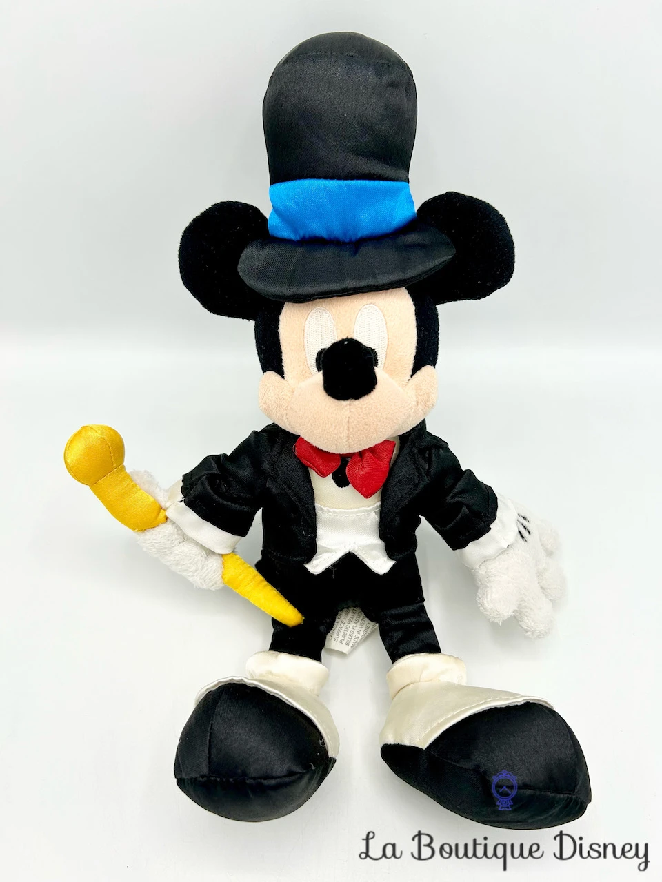 Peluche de Mickey Mouse vêtu d’un magnifique costume de magicien noir avec une chemise blanche et un noeud papillon rouge. Il a sur la tête un chapeau haut de forme noir et bleu. Il tient dans sa main une grande canne / baguette jaune. Mickey est prêt à faire vivre la magie !