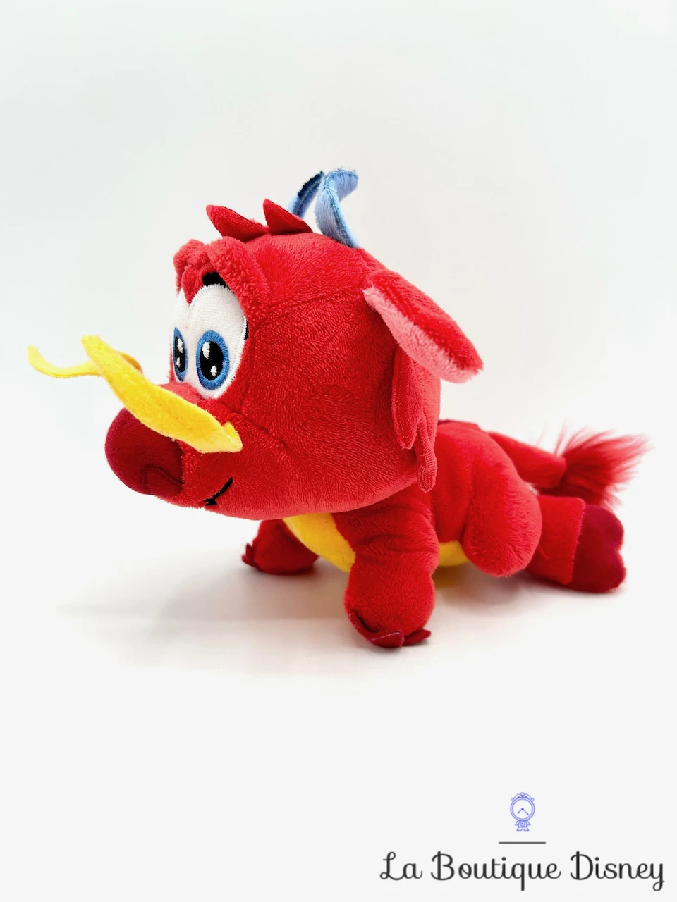 Peluche du petit dragon rouge du dessin animé Mulan, Mushu. Avec son petit sourire brodé et ses yeux bleus, il saura combler petits et grands. Il tient sur ses quatre pattes. Il est très mignon et pourra se glisser facilement partout avec vous !