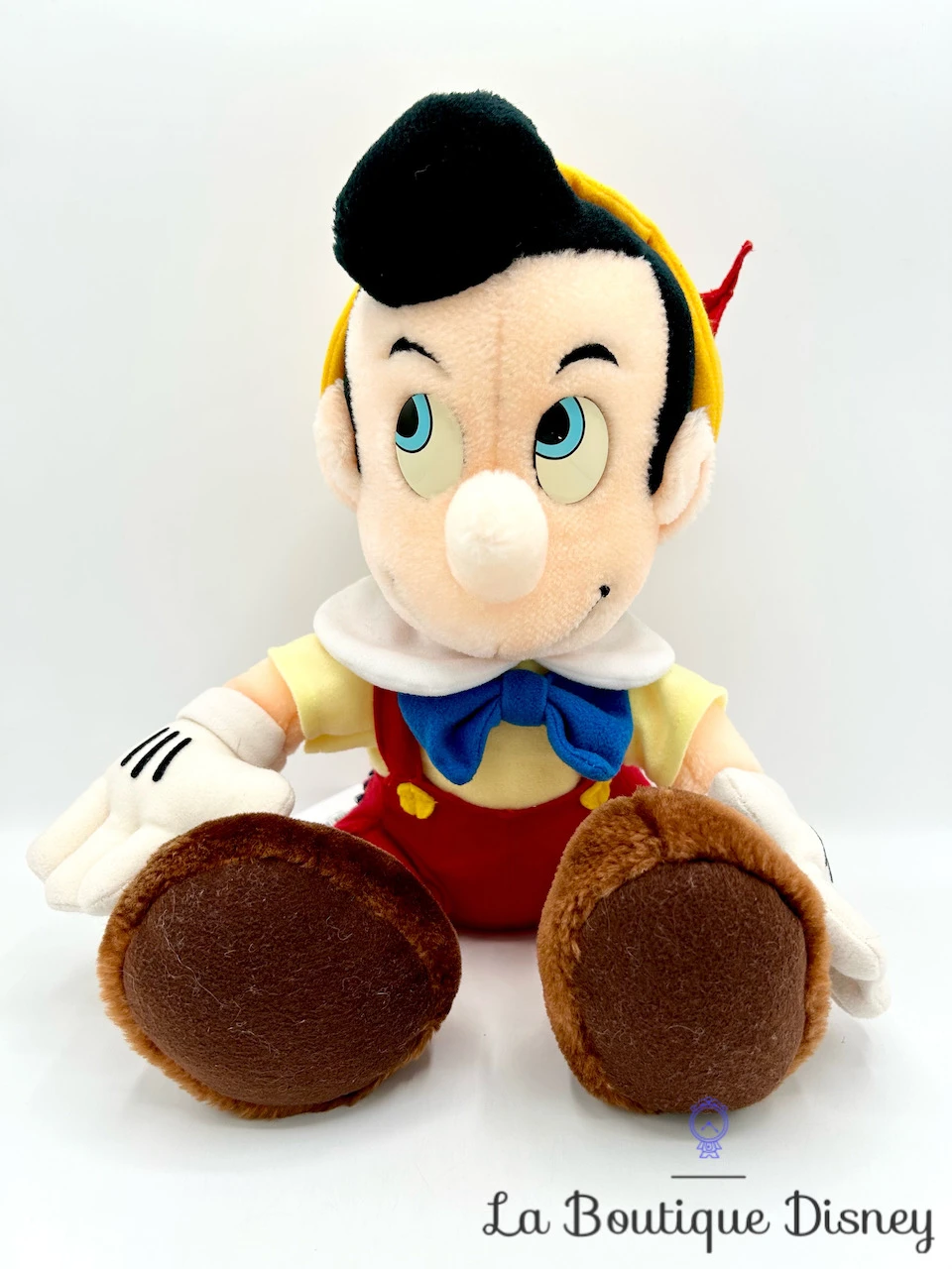 Peluche de Pinocchio, le pantin en bois conçu par Geppetto qui prendra vie grâce à la Fée Bleue et deviendra un véritable petit garçon. Pinocchio a un chapeau jaune avec une plume rouge, une salopette rouge et un noeud papillon bleu. Ses grands yeux bleus sont en plastique dur et sa bouche est brodée. Tient très bien assis.