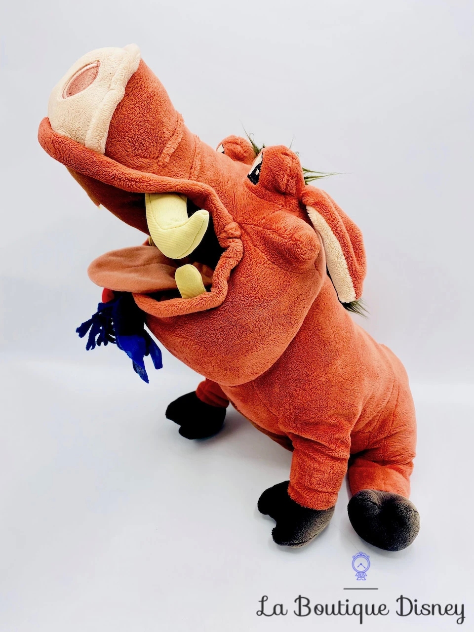 Peluche toute douce de Pumbaa, le célèbre phacochère ami de Simba et acolyte de Timon. Il est marron, avec son museau rose clair. Yeux et narines brodés. Petite crinière et bout de la queue en poils noirs. Dans sa grande gueule, Pumbaa tient des insectes bleu et rouge qu’il vient de manger. Ils sont reliés par des fils noirs pour ne pas le perdre. Possibilité de les cacher sous la langue de Pumbaa. Peluche assez grand format (47 cm).