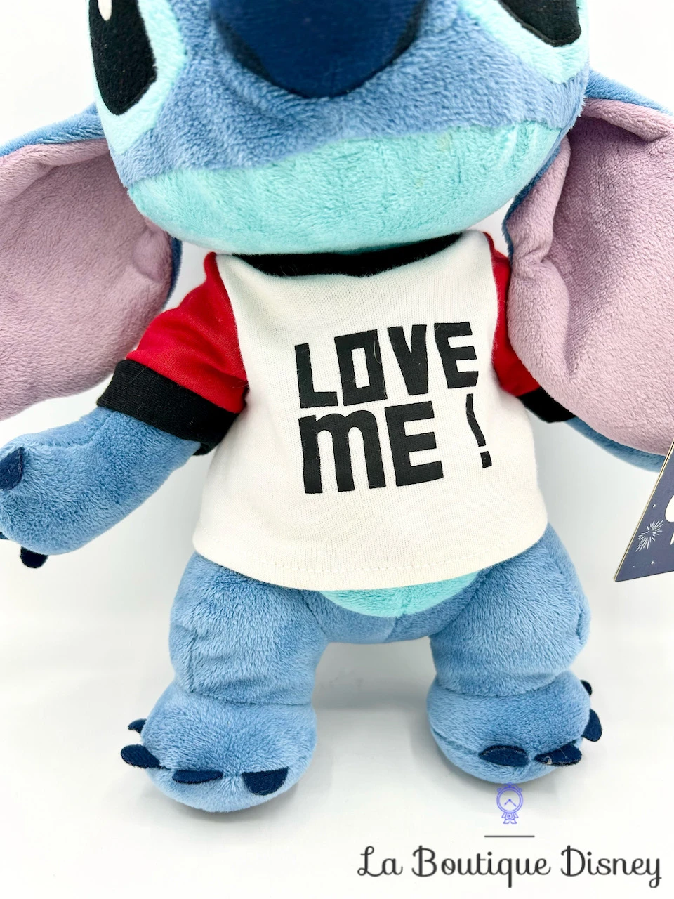 Peluche en polyester de votre petit monstre extraterrestre bleu favori, Stitch ! Il a de longues oreilles pendantes et porte un maillot tee-shirt rouge blanc et noir sur lequel se trouve l’inscription « Love Me ! ».