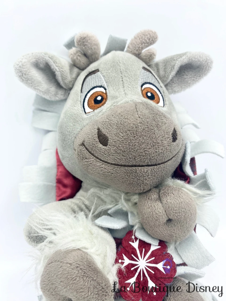 Peluche du plus célèbre des renne gris, Sven ! Il a de petites oreilles et des yeux marrons brodés. Il est entouré d’une couverture bordeau à franges grises. Fermeture du couffin grâce à un scratch. Sur la fermeture vous trouverez une petite fleur bordeau avec un flocon de neige blanche au milieu.