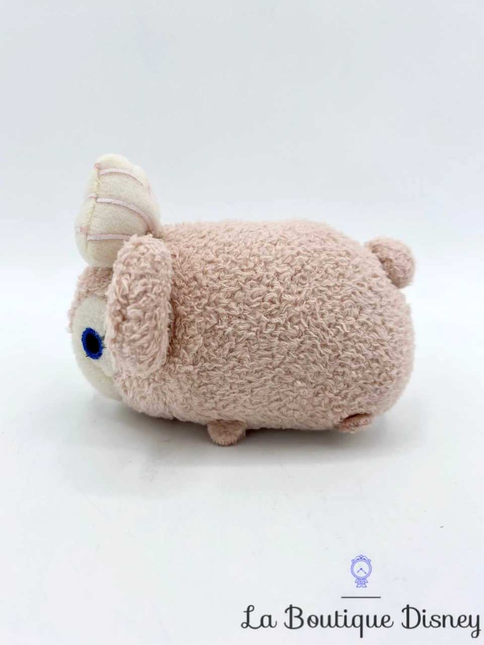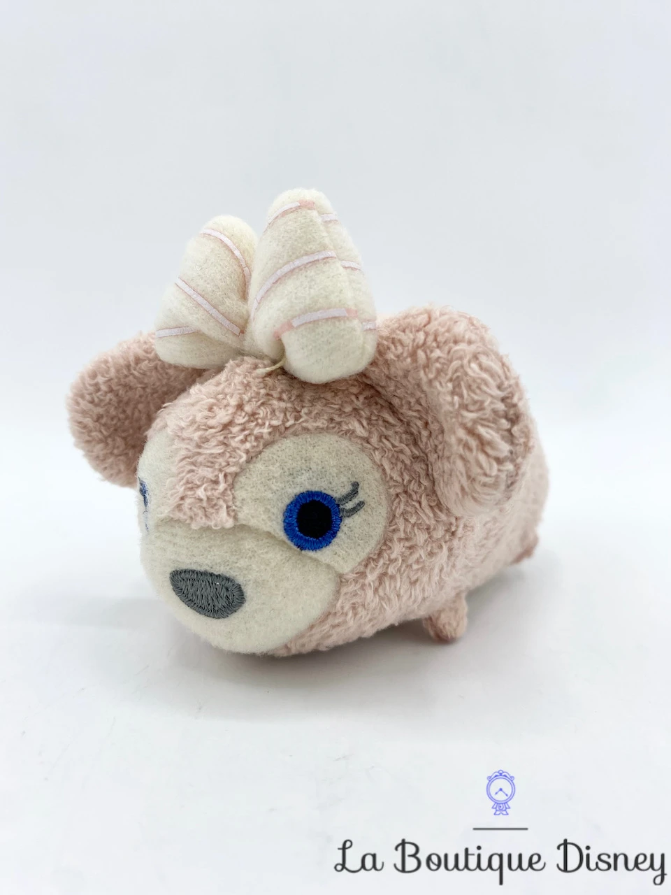 Petite peluche en polyester de Shelliemay, le petit ours rose clair amie de Duffy. Elle a un noeud beige à rayures sur la tête et une petit tête de Mickey est brodée en rose à l’arrière de son dos.