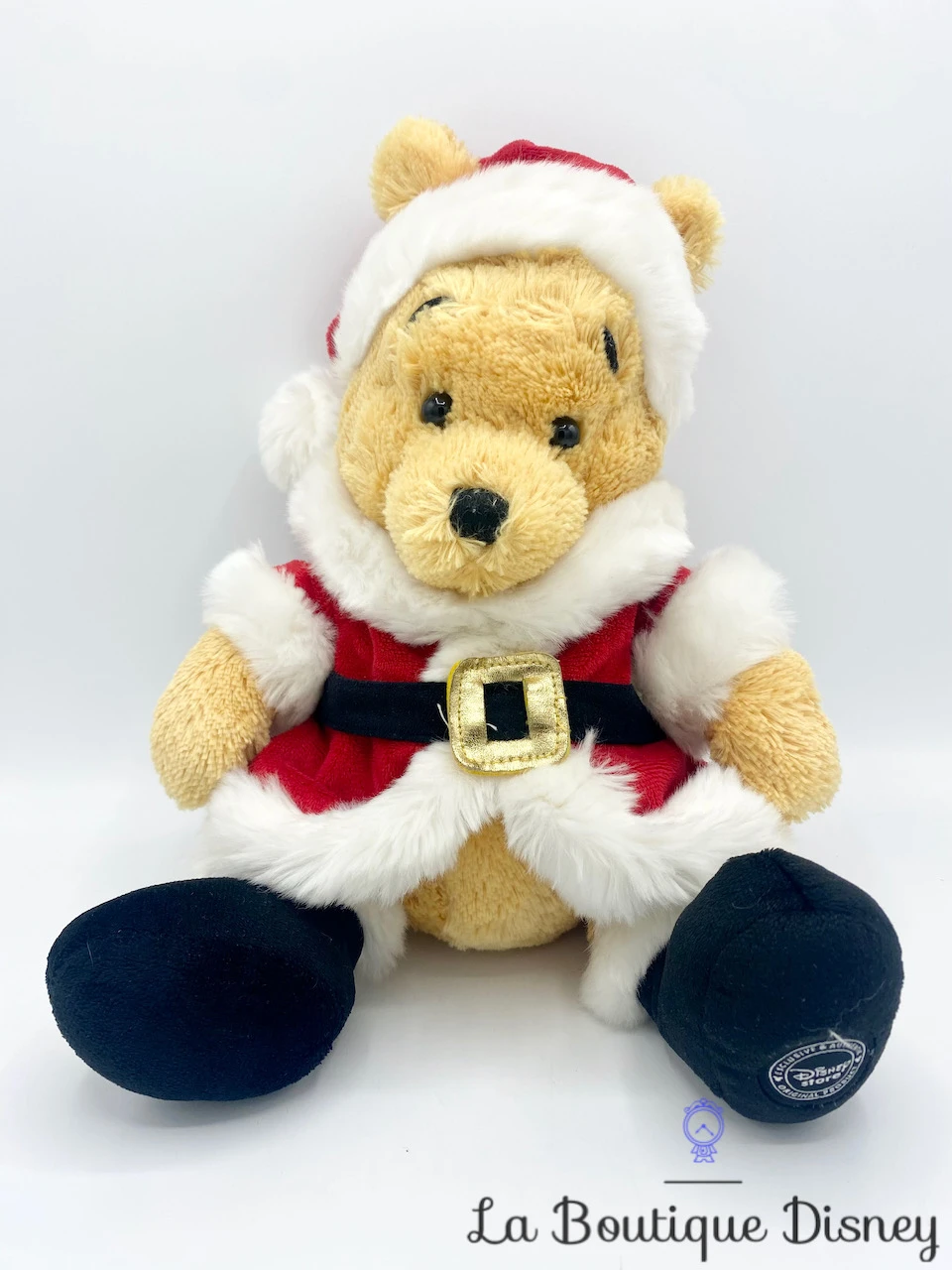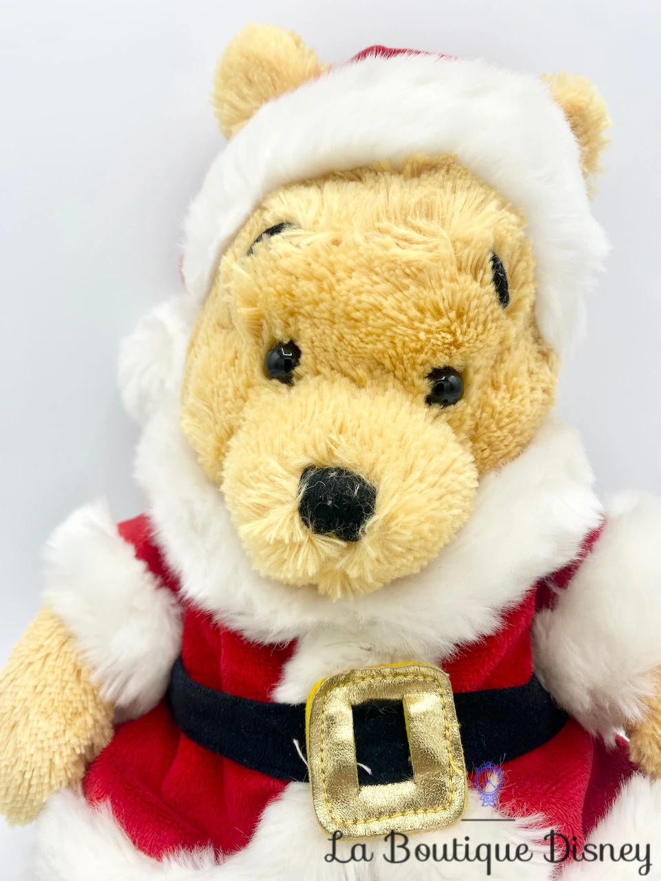 Peluche représentant Winnie l’ourson dans une tenue de Père Noël. Il porte un manteau rouge bordé de fourrure blanche et une ceinture noire avec une boucle dorée. Il a des bottes noires à fourrure et un bonnet de Noël rouge avec un pompon blanc d’où en ressort ses deux petites oreilles jaunes. Ses yeux sont en plastique noir, ses sourcils, son museau et sa bouche sont en feutrine noire. Peluche idéale pour les fêtes de fin d’année ! Écusson Disney Store Exclusive & Authentic sous le pied de la peluche.