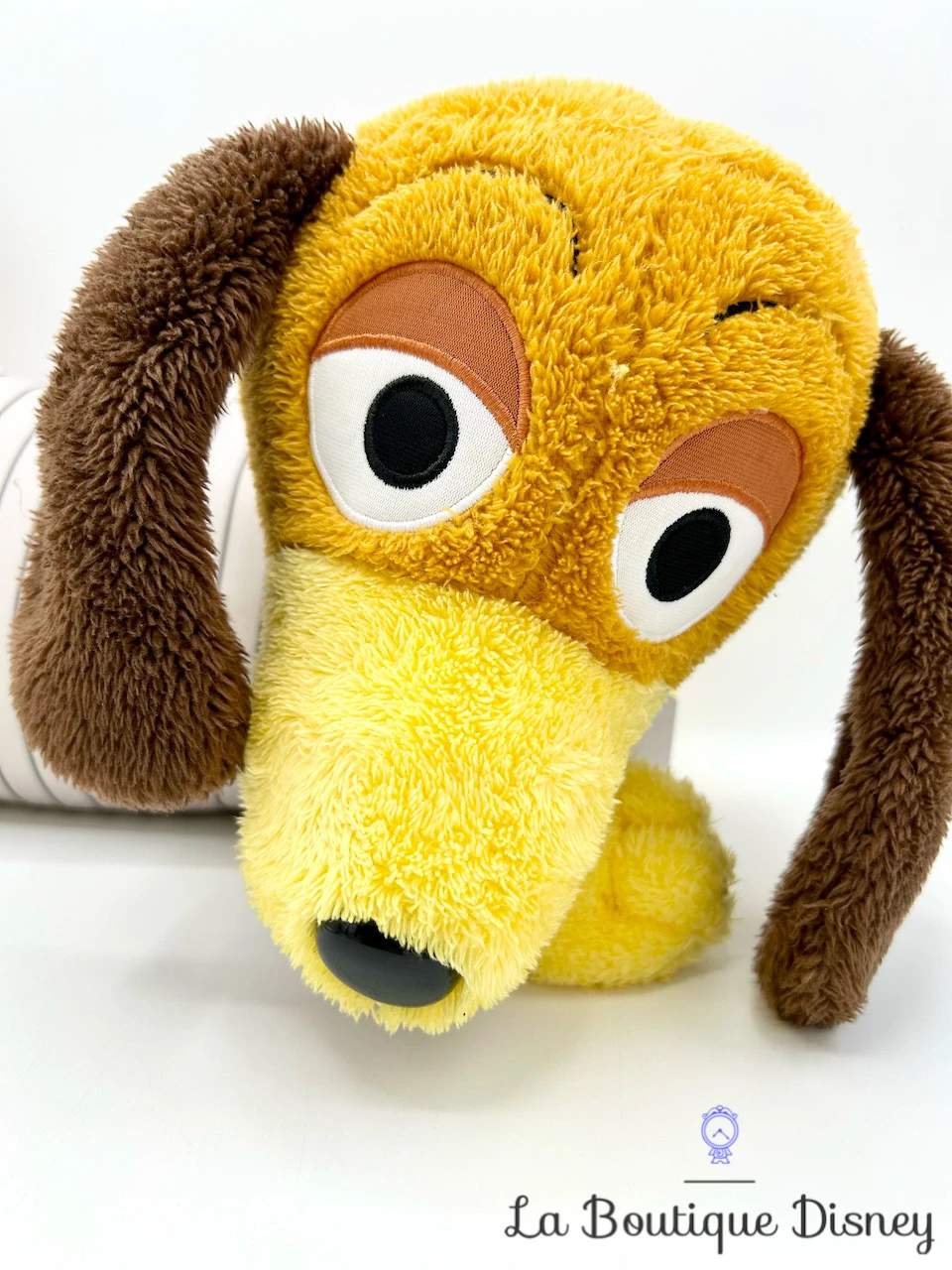 Peluche grand format de Zig Zag, le chien à ressort du dessin animé Toy Story. Il a une tête marron en poils doux, avec de longues oreilles marron foncé et des grands yeux brodés. Son corps en tissu représentant un ressort. Peluche grande taille, parfaite pour compléter une collection !