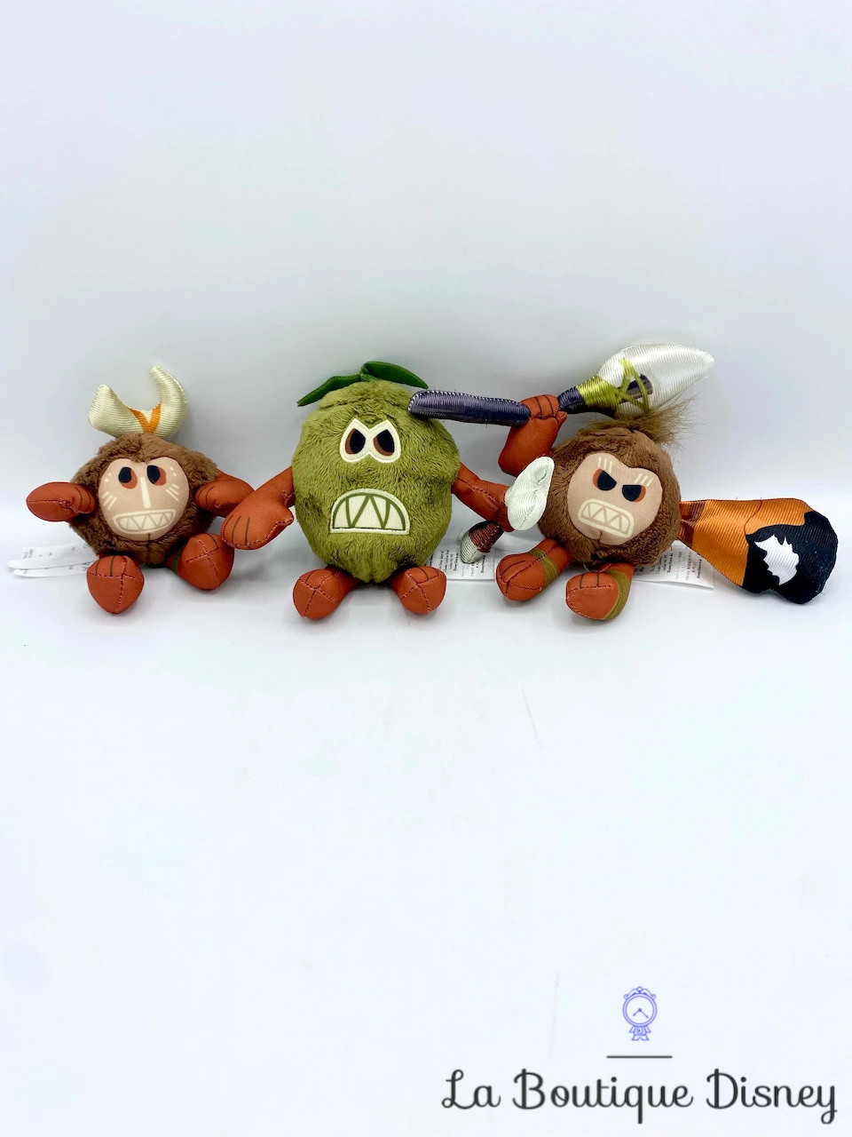 Peluches de trois Kakamora, des noix de coco en armure vivant sur des bateaux et sillonnant les océans pour des actes de piraterie. Ils prennent d’ailleurs en chasse Vaiana et Maui afin de récupérer le Coeur de Te Fiti ! Ils sont marrons, verts et orange et ils tiennent des armes diverses à la main. Ce sont de vrais petits guerriers !