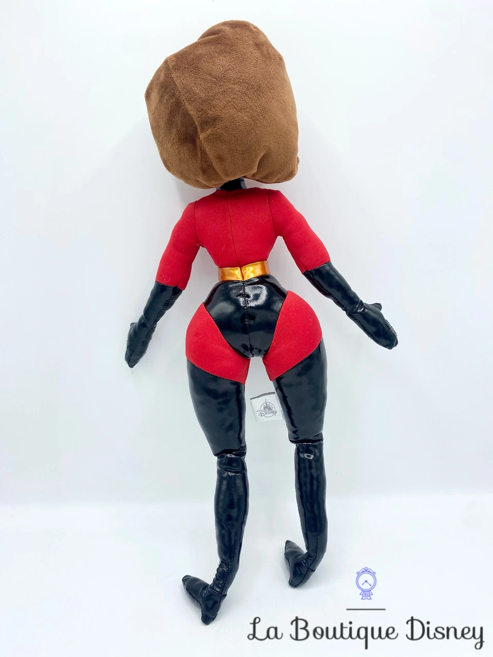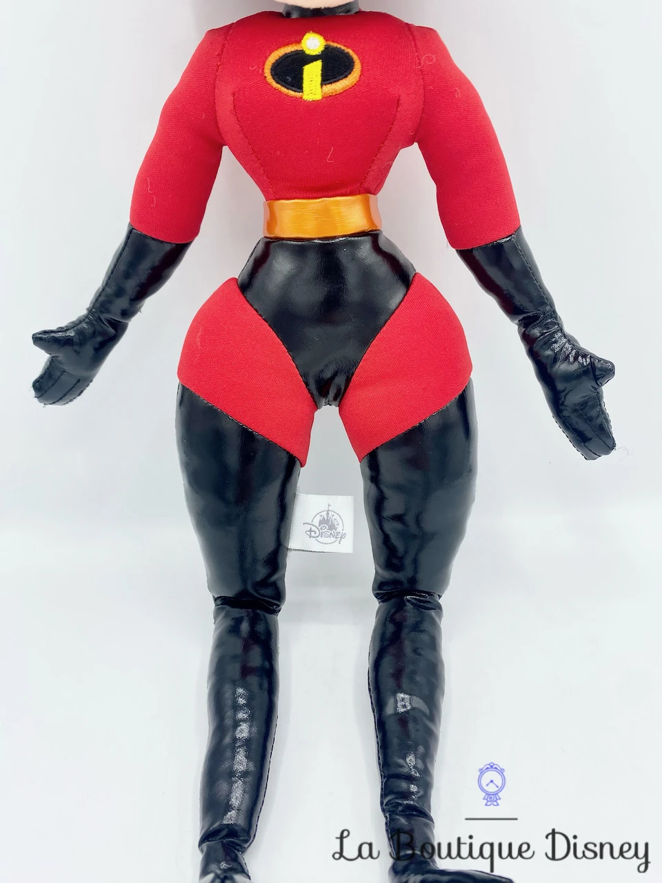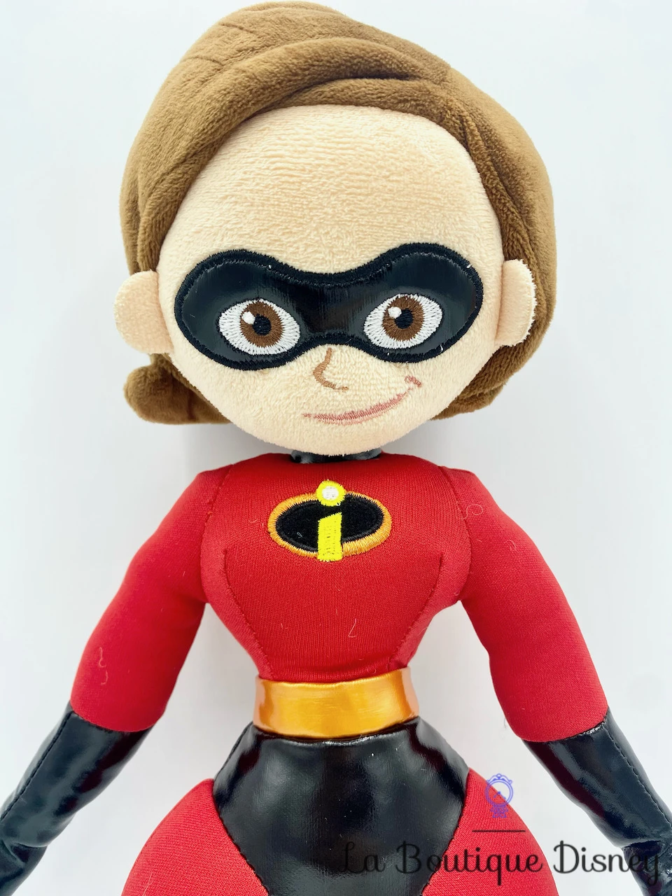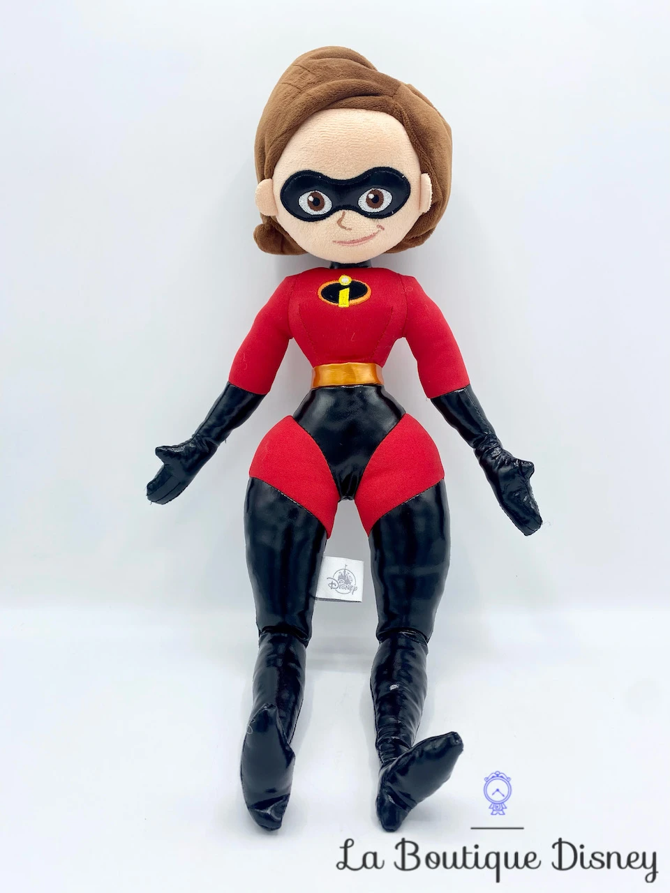 Peluche de la mère de la famille des Indestructibles, Elastigirl. Elle porte sa combinaison rouge et est prête à partir à l’action ! Elle a le logo « I » de la famille des Indestructibles brodé sur la poitrine. Une partie de sa combinaison est en matière noire plastifiée. Visage brodé avec un masque noir. Cheveux courts marrons. La maman de la famille est prête pour de nouvelles aventures !