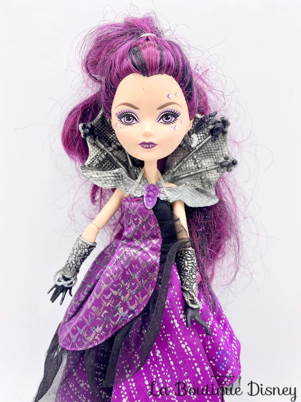 Poupée avec des cheveux longs violets et noirs. Robe à paillettes noir et violette avec du tulle, dans l’esprit du XVIIIe siècle, style carnaval de Venise. Accessoires : gants, tour de cou, sac à main et brosse à cheveux.