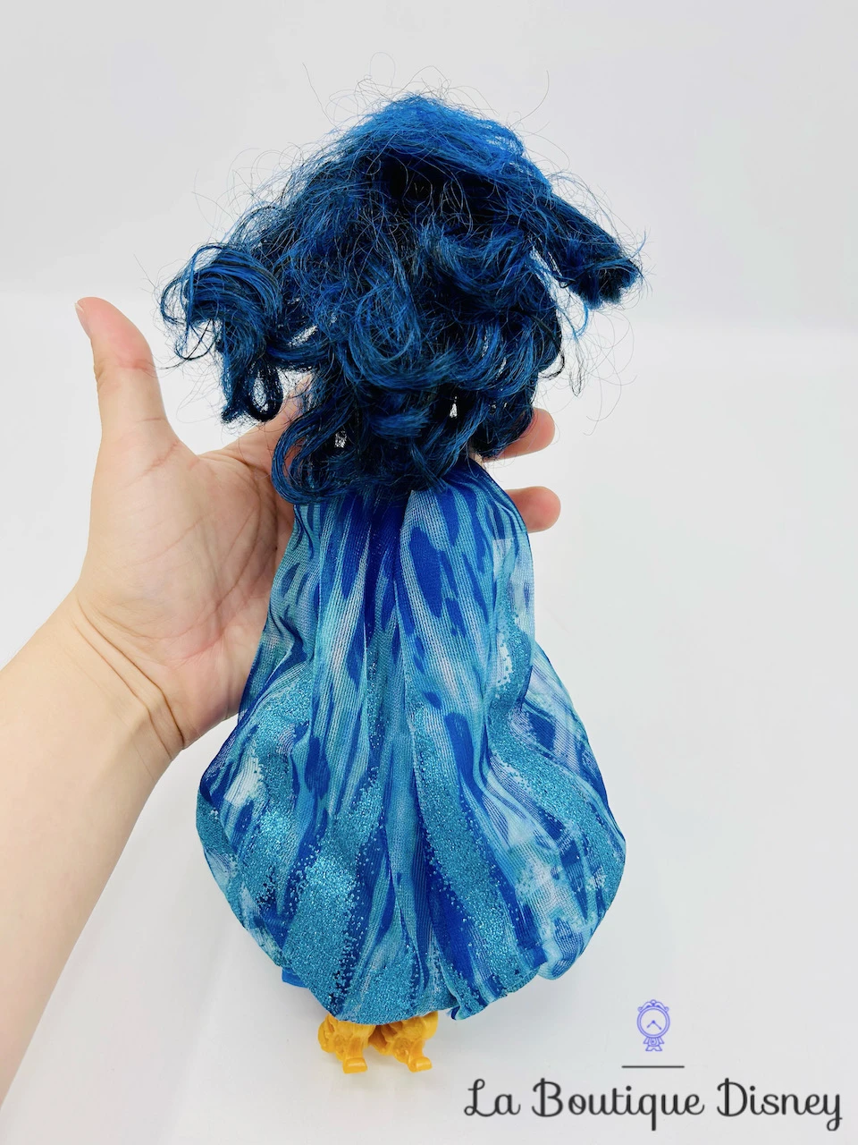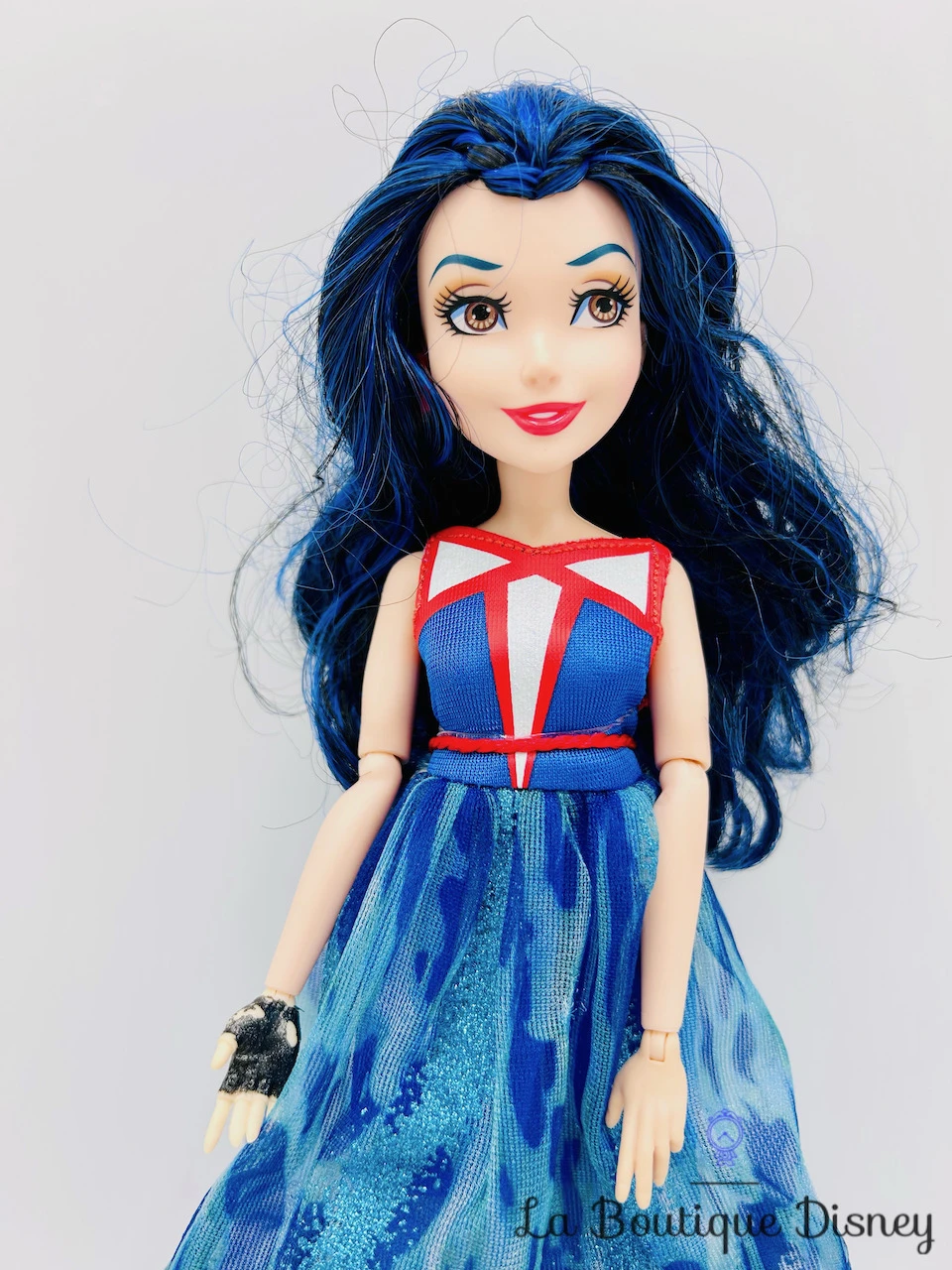 Poupée de Evie « Isle of the Lost », fille de la reine. Elle est ici dans une tenue du « Pack Exclusif » avec une superbe robe bleue, prête pour le Bal du Néon Fluo. Poupée articulée aux cheveux bleus et noirs.