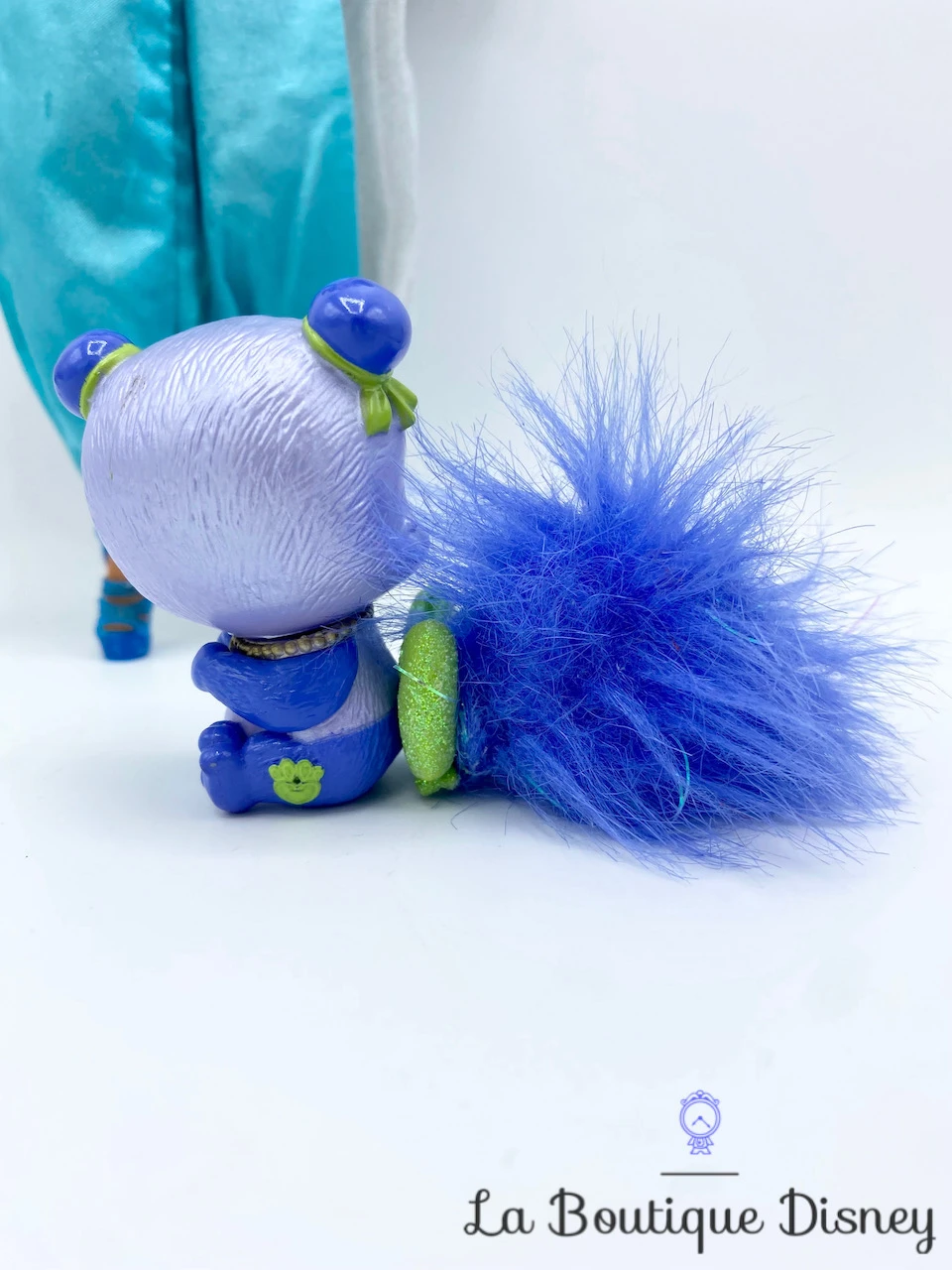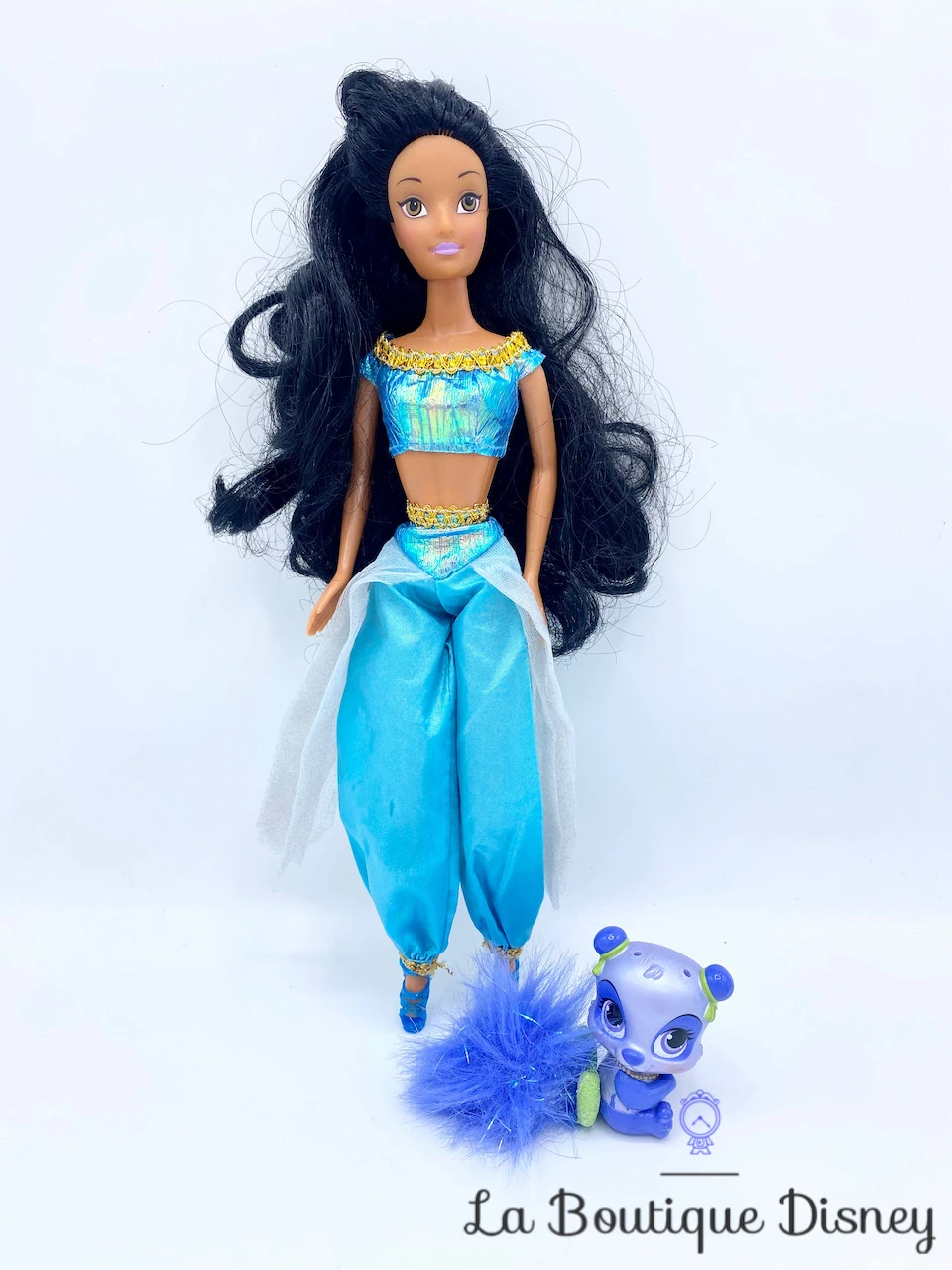 Poupée mannequin classique de la princesse Jasmine avec sa longue chevelure noire. Elle porte son ensemble deux pièces bleu et or de princesse orientale. Le haut est brillant avec des ornements dorés et le pantalon est voilé. Elle est accompagnée de son petit compagnon le Palace Pets bleu, nommé Blossom, son ourson.