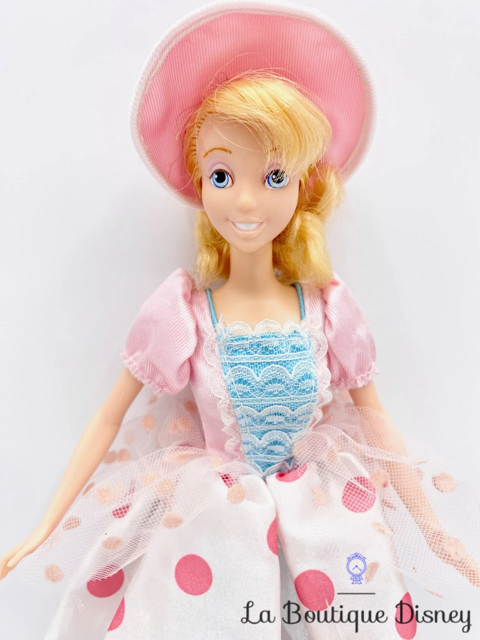 Poupée vintage mannequin de La Bergère, un des jouets du dessin animé Toy Story. Elle est blonde et porte un chapeau rose. Sa robe est rose et bleue avec de la dentelle. Elle a grand jupon satiné avec des pois roses. Petites chaussures noires.