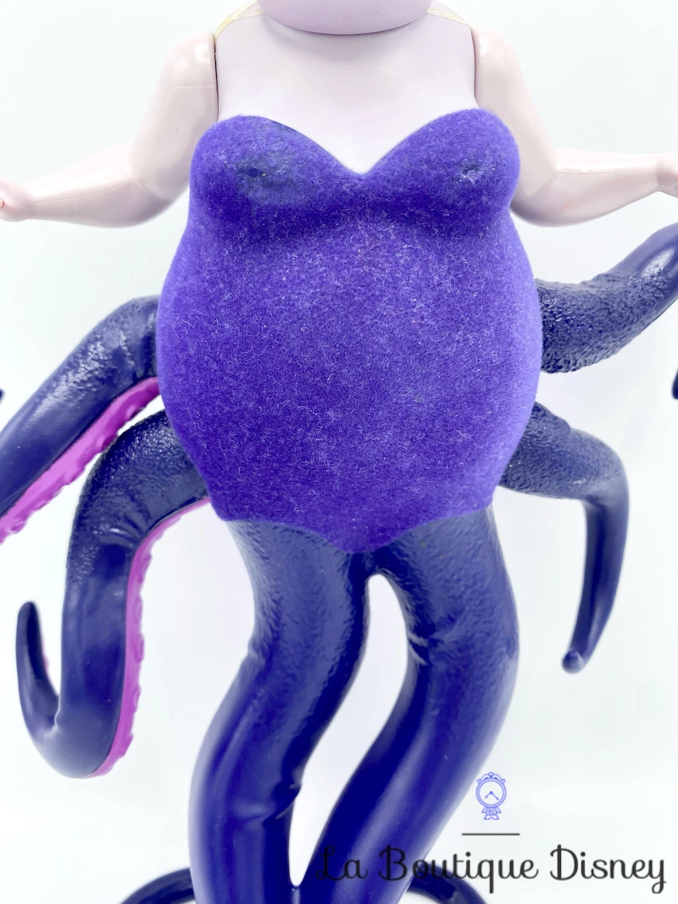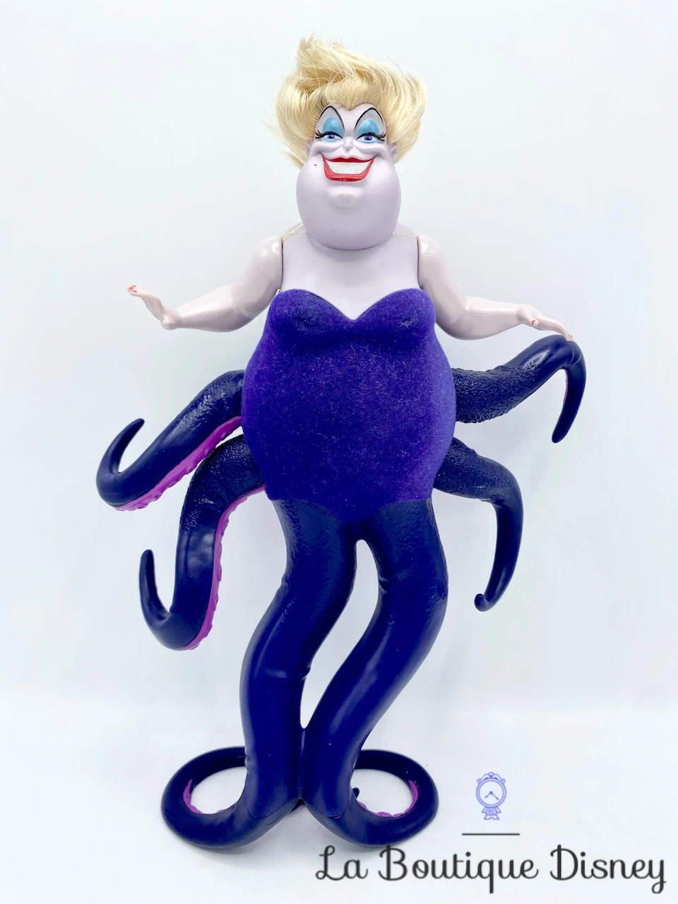 Poupée de Ursula, la méchante sorcière des mers mi-pieuvre mi-humaine. Le buste est recouvert d’un velours ras, elle a des cheveux blancs relevés sur la tête, des yeux très maquillés et du rouge à lèvre rouge. Elle a de longues tentacules mauves et violettes avec des ventouses dont deux lui permettent de tenir debout. Avec Ursula de la collection Disney Villain amuse-toi à créer de nouvelles aventures !