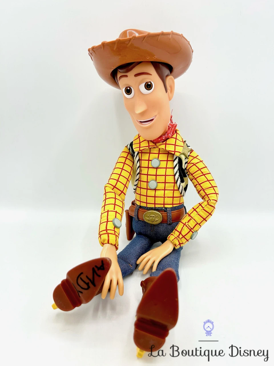 Figurine articulée « Talking Woody » du célèbre cow-boy, Woody. Woody est un cowboy, un vrai de vrai, le shérif qui est le copain de tout le monde. Il était jadis la vedette de l’émission de télévision Woody’s Roundup ! Il est vêtu de sa chemise jaune à carreaux de shérif, son jean bleu et sa ceinture marron. Il porte des grandes bottes avec l’inscription « Andy » sous l’une d’entres elles. Tête en plastique dur et corps mou. En tirant la ficelle dans son dos, Woody prononce différentes phrases en anglais !